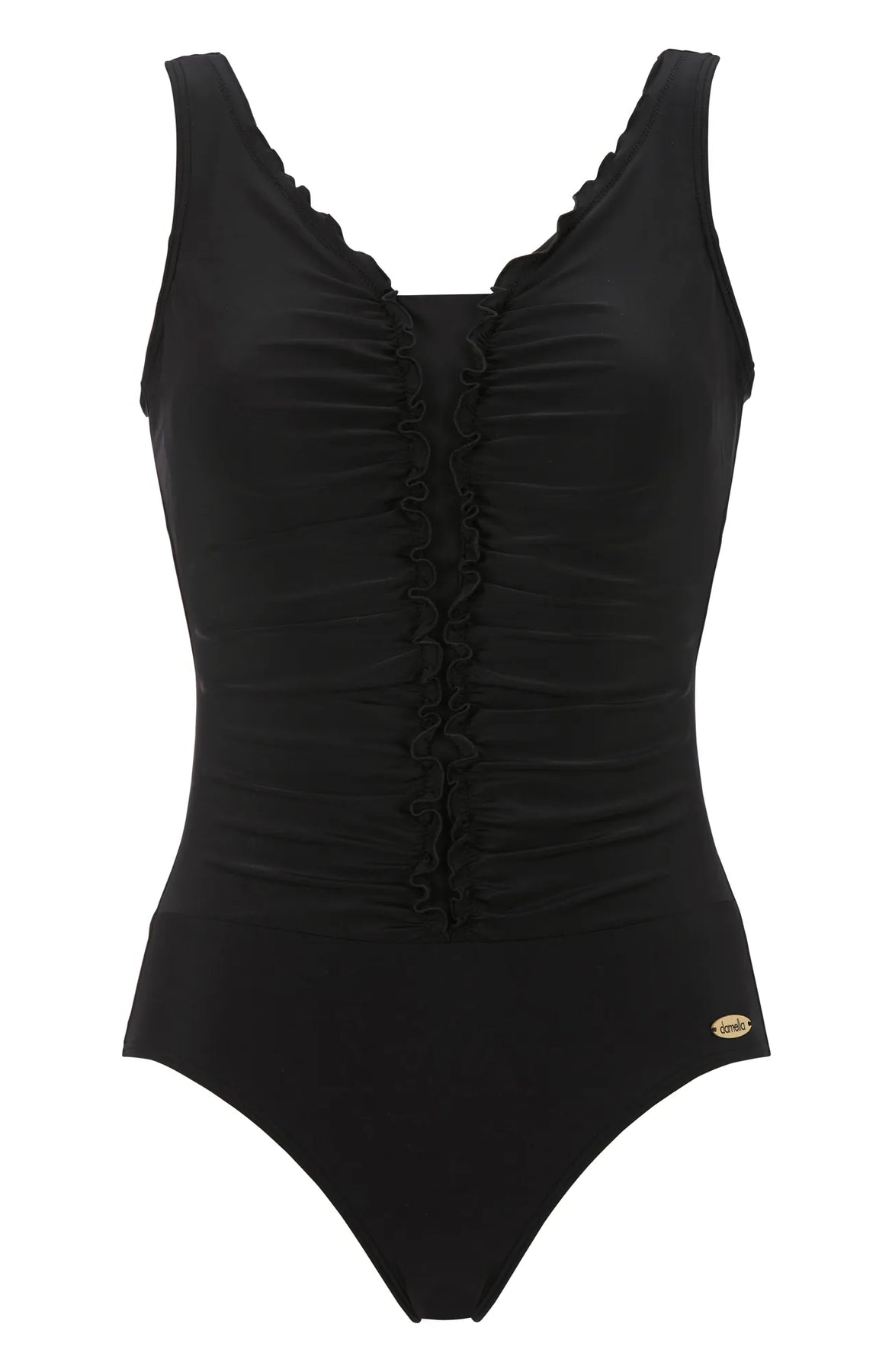 Utforska Damellas enfärgade baddräkt Jennifer, som kombinerar stil och komfort med en mjukt vadderad bh inuti för optimalt stöd. Den dekorativa draperingen framtill i ett avvikande tyg ger en unik och elegant touch. Det inbyggda powernetet skapar en smickrande och slimmande effekt som framhäver din figur på ett snyggt sätt.