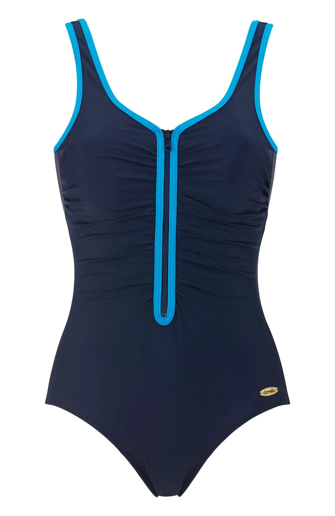 Förnya din badklädeskollektion med vår baddräkt med praktiskt blixtlås fram. Den moderna designen ger inte bara en trendig touch utan gör den också lätt att ta på och av. Med en smickrande passform och justerbara axelband blir denna baddräkt ett stilsäkert och bekvämt val för stranden eller poolen.