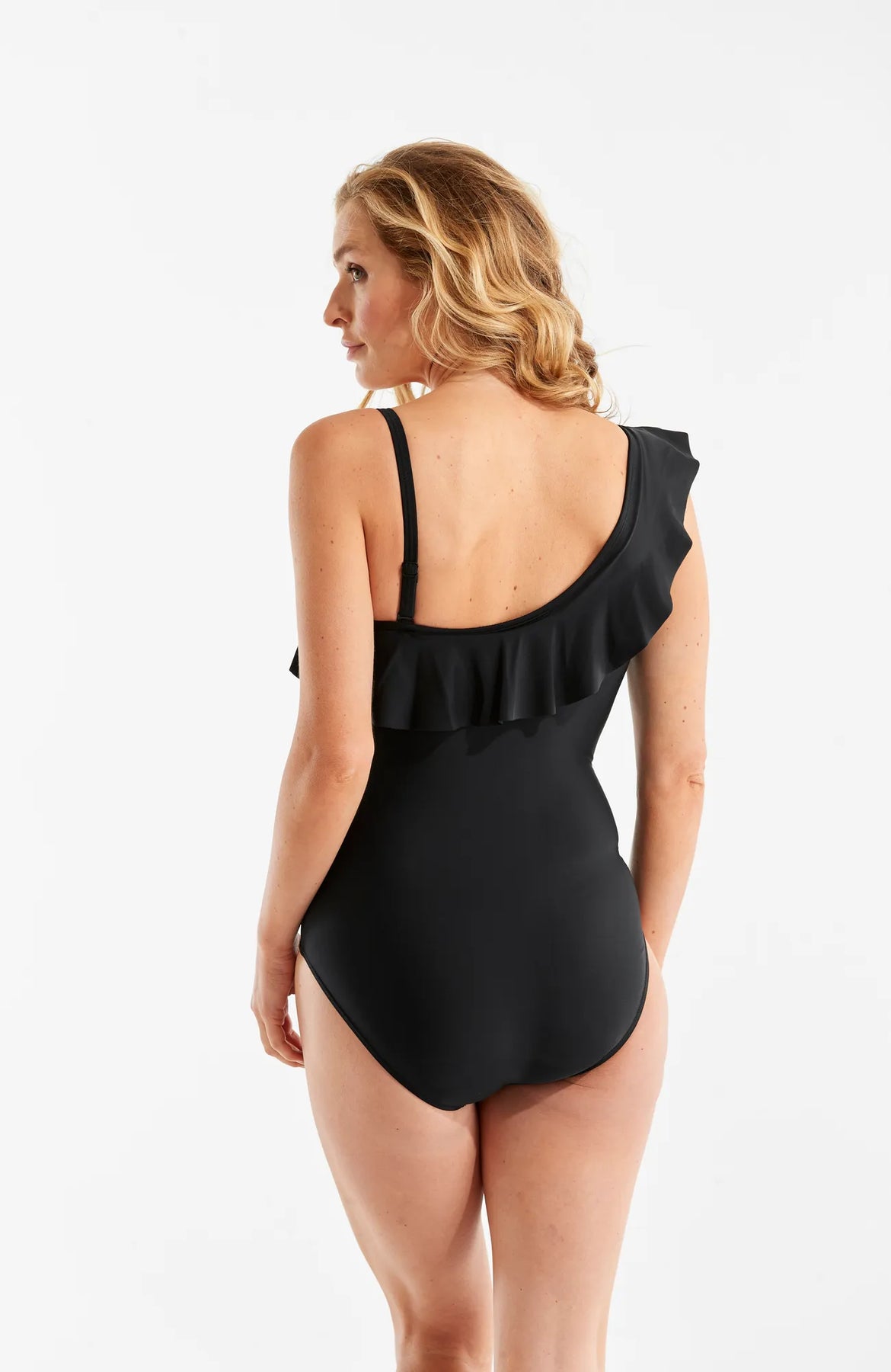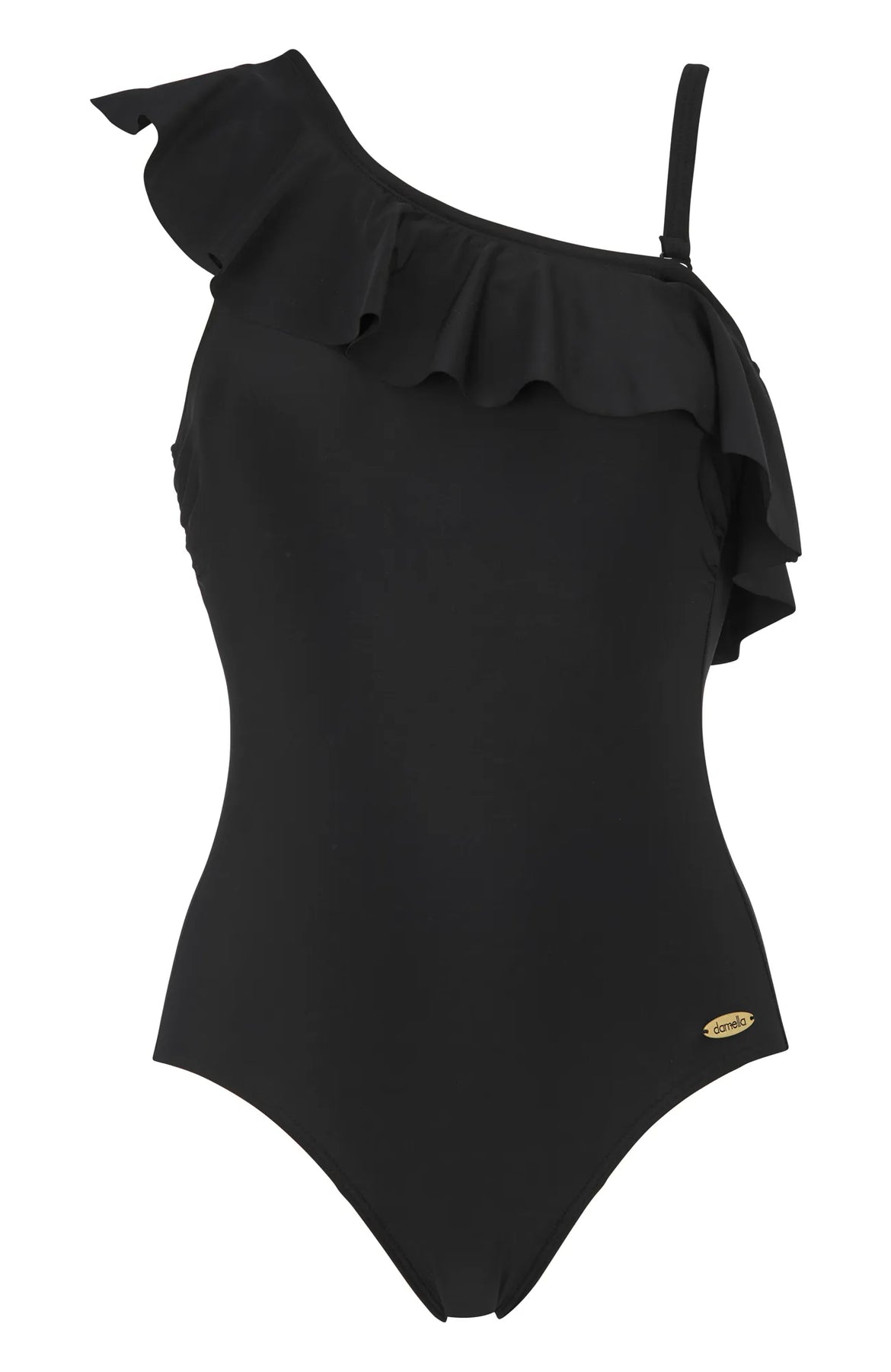 Upptäck baddräkt Teresa med volang över ena axeln för en touch av lekfull elegans. Den är utrustad med en mjukt vadderad bh och avtagbart axelband för anpassningsbarhet. Powernetet inuti ger en slankande effekt och skapar en smickrande passform.