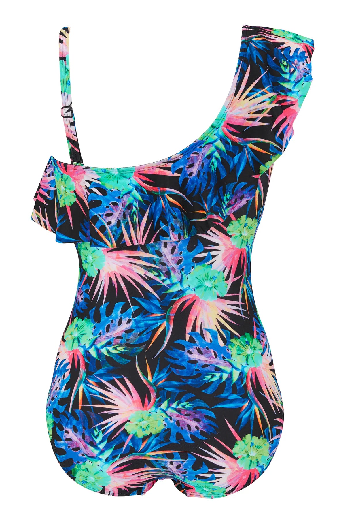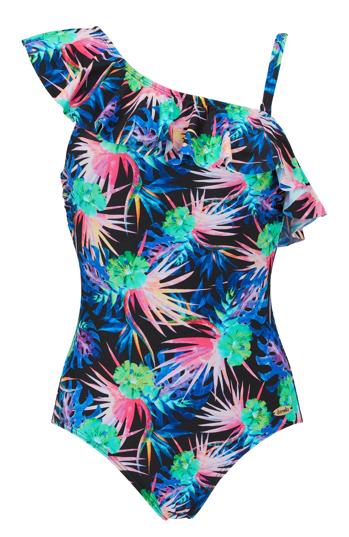 Baddräkt Teresa med volang över ena axeln för en touch av lekfull elegans. Den är utrustad med en mjukt vadderad bh och avtagbart axelband för anpassningsbarhet. Powernetet inuti ger en slankande effekt och skapar en smickrande siluett.