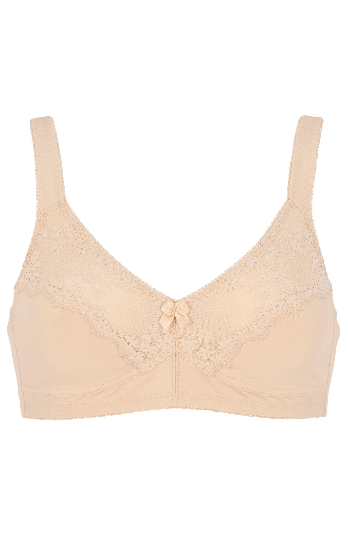 Njut av en mjuk och bygellös bomulls-BH med vackra spetsdetaljer som sträcker sig från mitten av BH:n upp mot de justerbara axelbanden. Utan vaddering ger den en naturlig och lätt känsla hela dagen. Den eleganta rosettdetaljen fram bidrar med en feminin touch. Från storlek 80D och uppåt är axelbanden bredare och bakre stängningen har tre hyskor för extra stöd och komfort. En perfekt BH för dig som värdesätter både stil och bekvämlighet.
