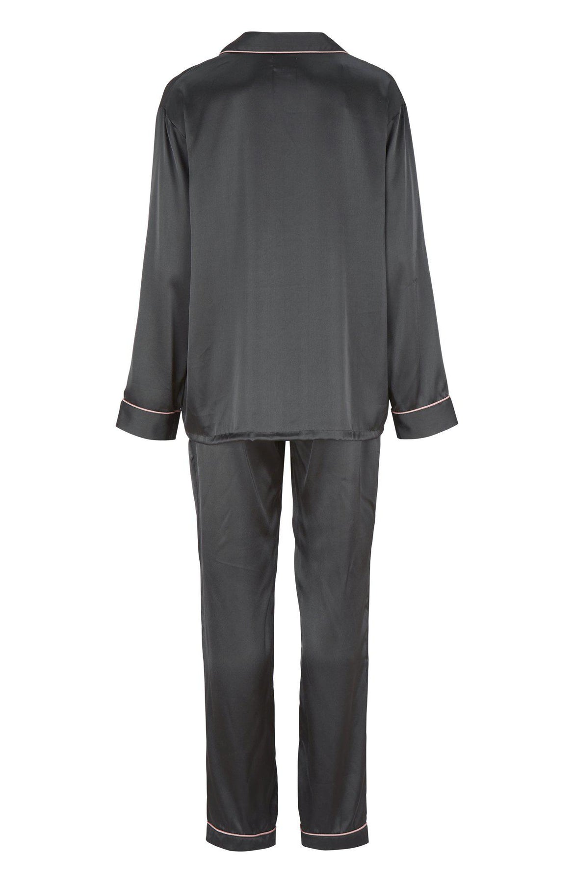 Vår satinpyjamas i 100% återvunnen polyester. Perfekt för avkoppling och en god natts sömn, denna pyjamas kommer att bli din favorit för lugna kvällar och avslappnande nätter. Designad med en elegant krage, långa ärmar och praktiska knappar framtill för enkel klädsel. Byxorna är designade med fickor och har en elastisk midja som erbjuder maximal komfort och anpassningsbar passform.