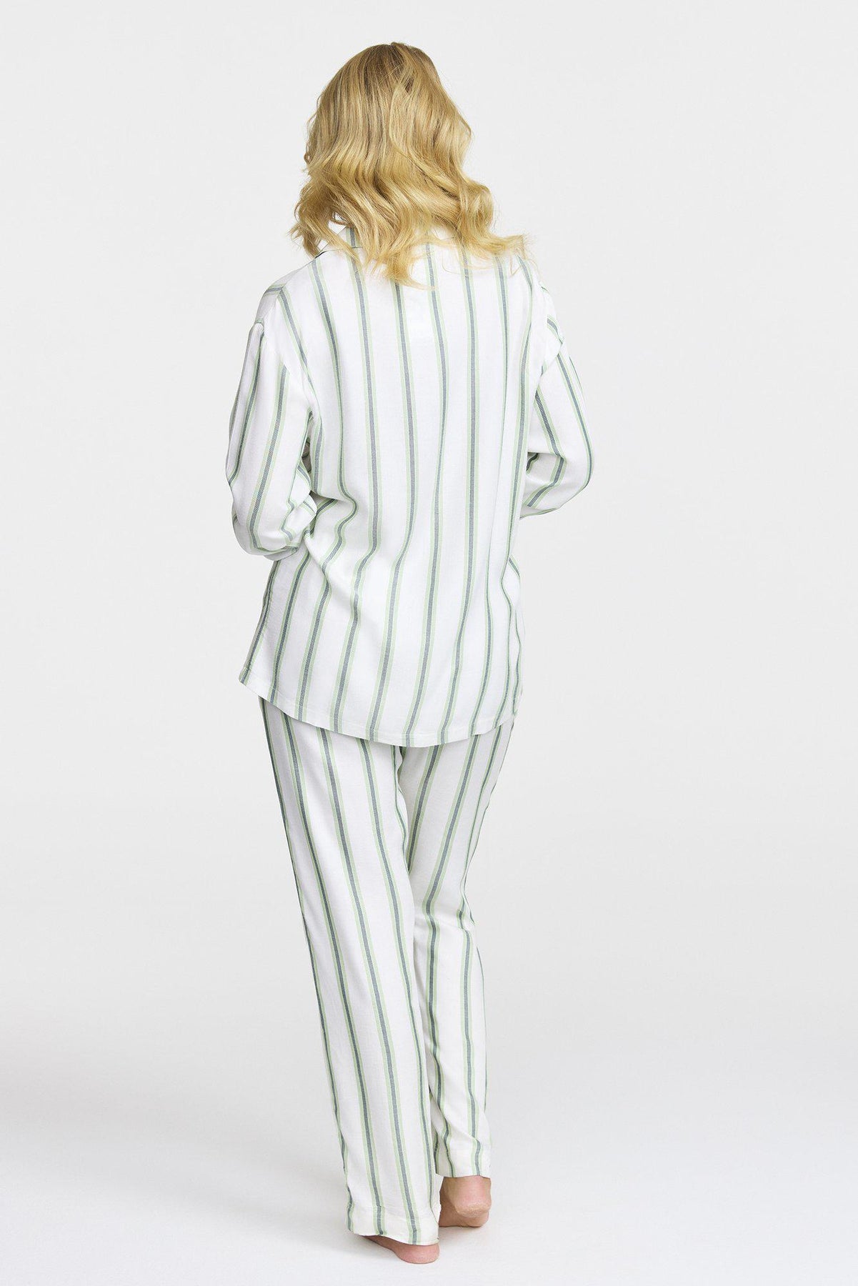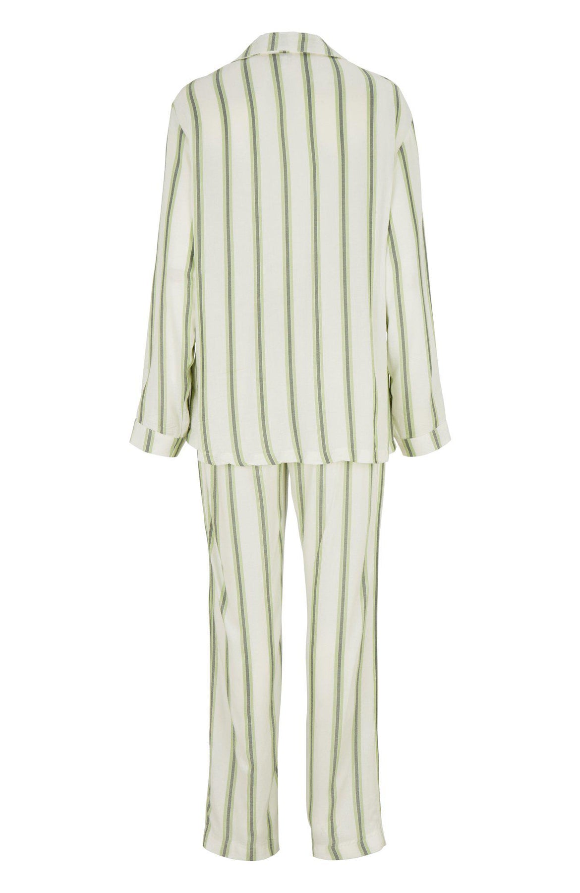 Vår randiga pyjamas i vävd viskos - en perfekt blandning av komfort och stil. Jackan har en krage, knappar framtill och långa ärmar. Byxorna har fickor och en elastisk midja för maximal bekvämlighet.