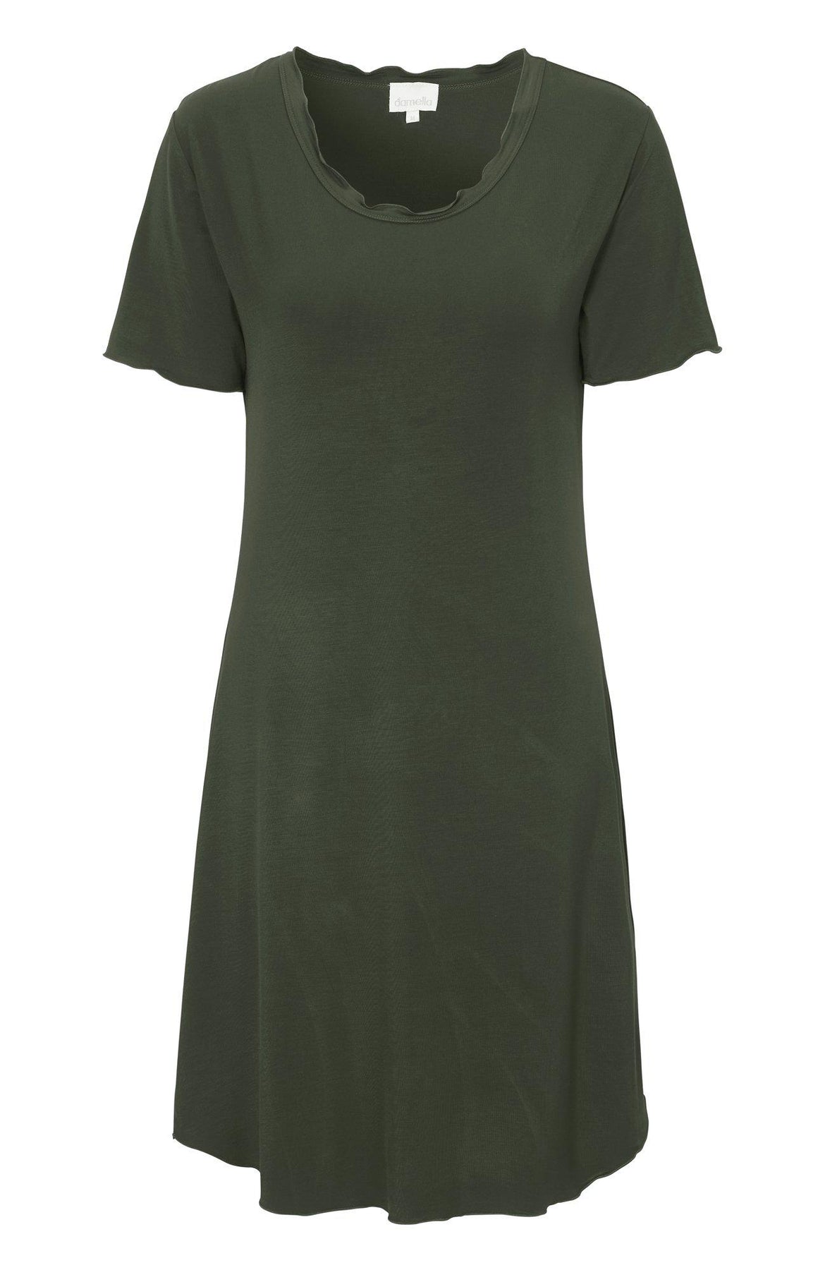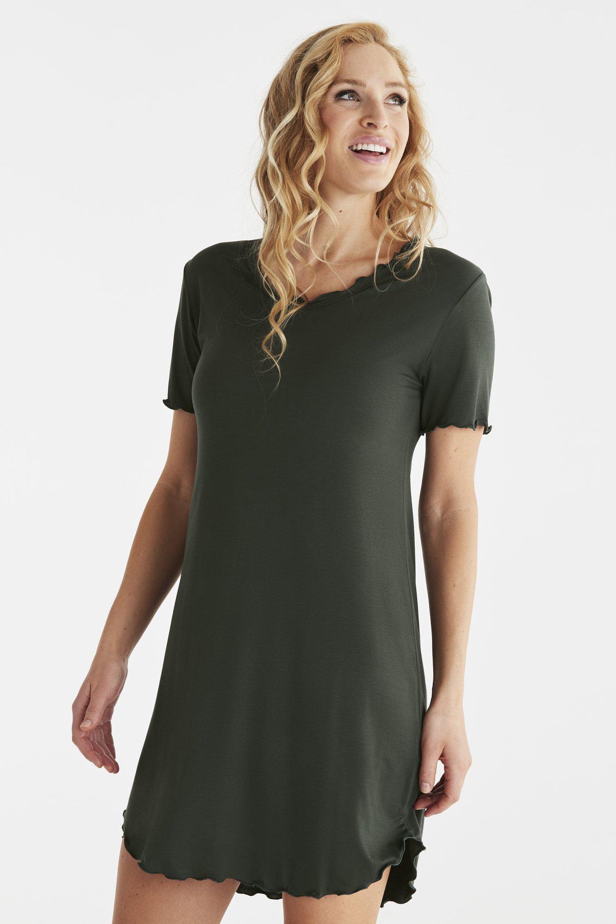 Ett nattlinne i bambuviskos med en elegant vågformad kant vid halsen och längst ned. Med sin rundade hals och korta ärmar är detta nattlinne både bekvämt och stilfullt. Tillverkat i bambu för en mjuk och skön känsla, vilket gör det till det perfekta valet för en fridfull natt.