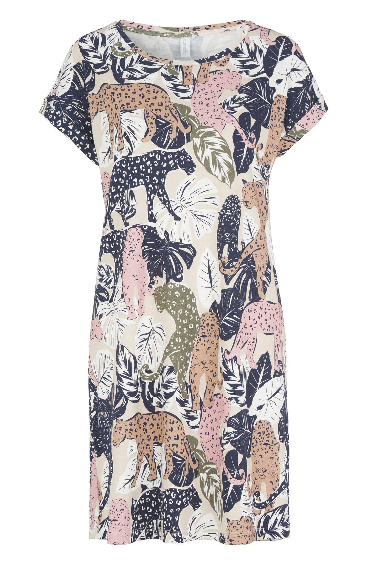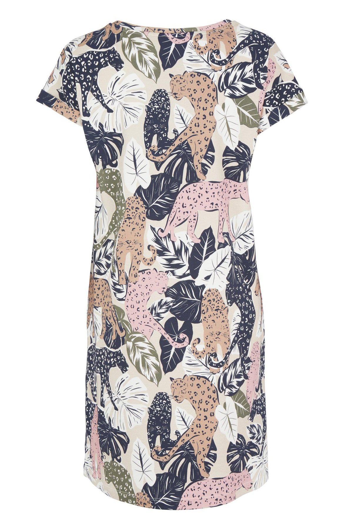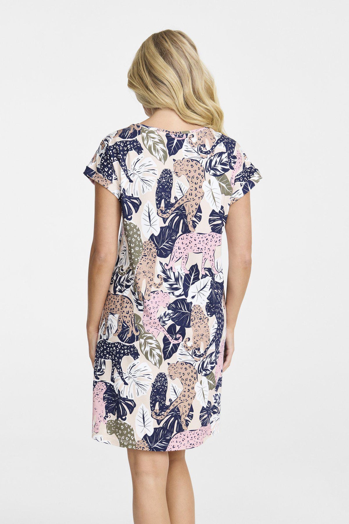 Damellas nattlinne har en klassisk rund halsringning och eleganta holkärmar med vikt kant, vilket skapar en stilren och tidlös look. Det vackra mönstret ger en charmig touch, medan det mjuka och flexibla interlocktyget känns behagligt mot huden.