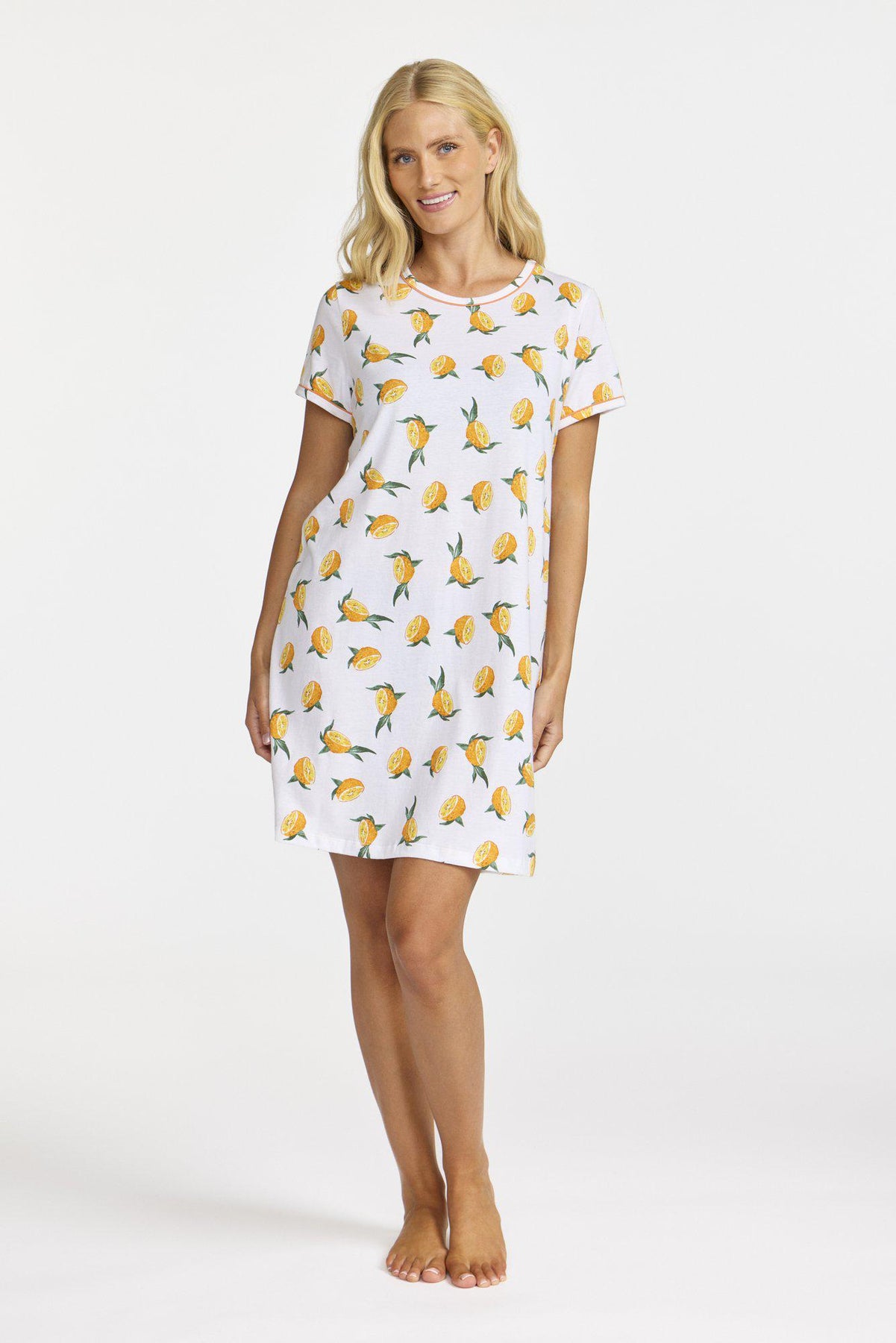 Bekvämt nattlinne i mjuk bomullsjersey med tryck över hela plagget som ger en livfull och lekfull känsla. Den runda halsringningen och de korta ärmarna skapar en avslappnad och klassisk silhuett, perfekt för mysiga kvällar och sköna nätter hemma.