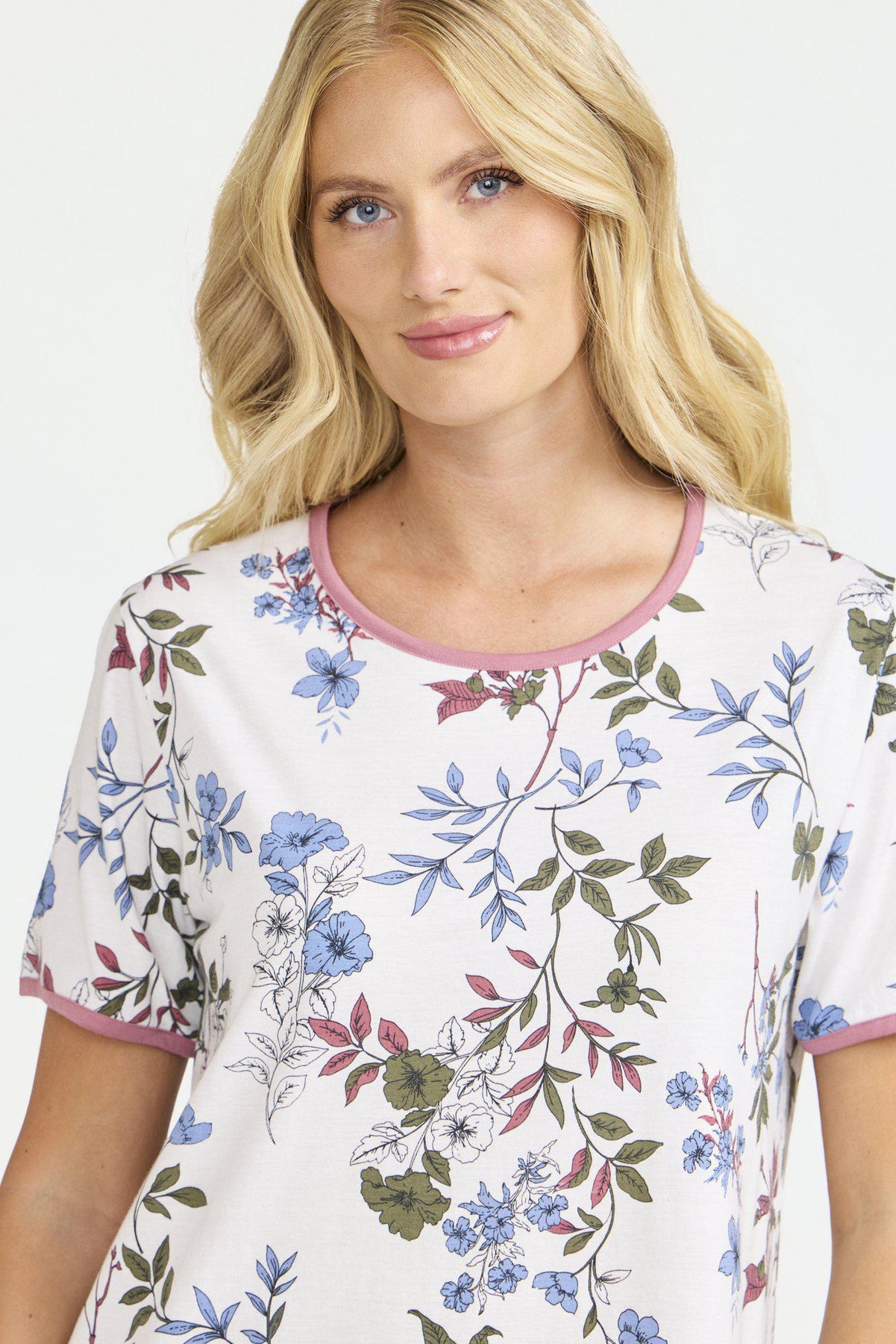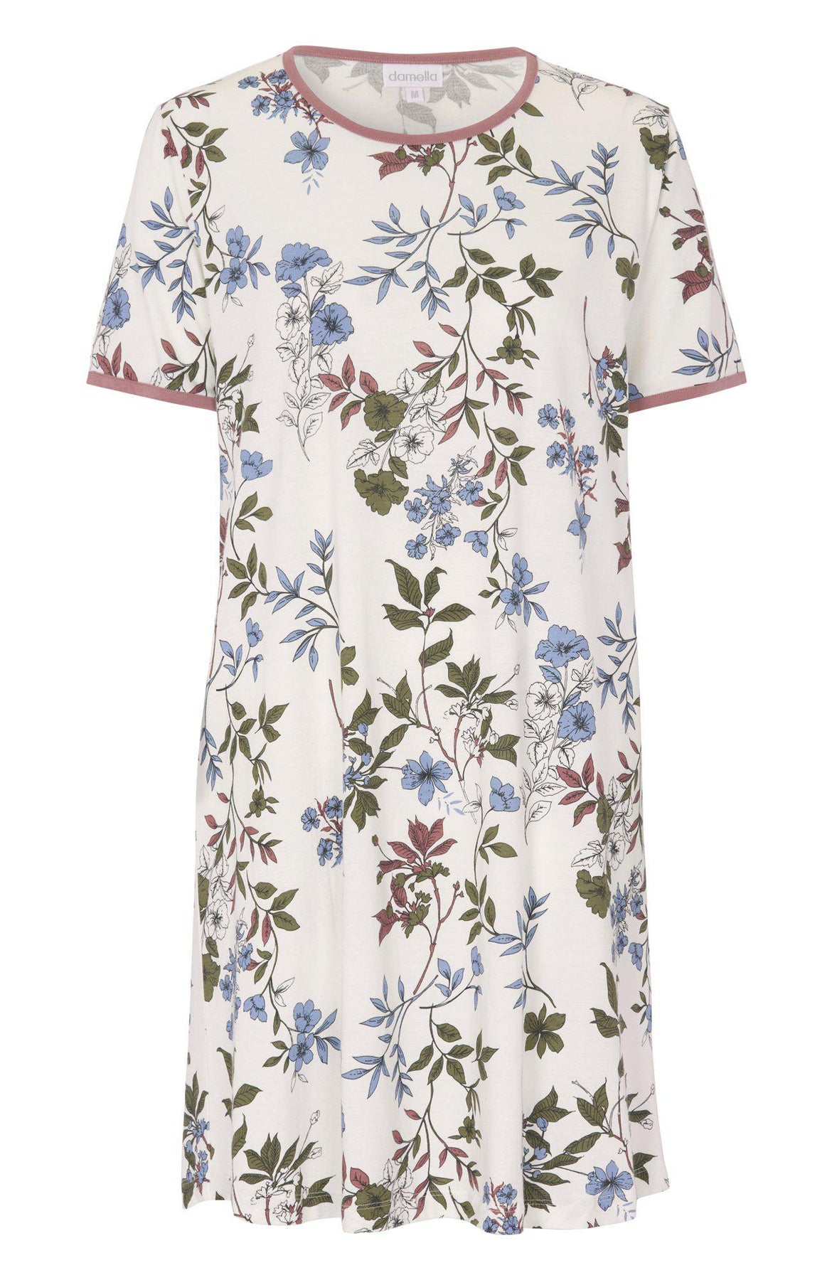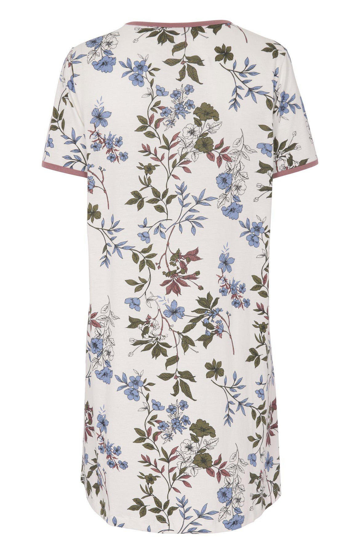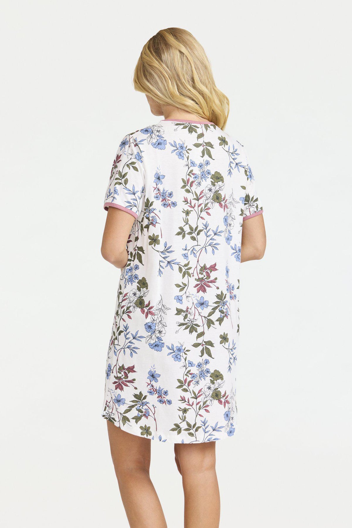 Mjukt och bekvämt nattlinne i mönstrad bomull/modal med U-ringad hals och korta ärmar. Tillverkat av en blandning av bomull och modal, ger nattlinnet ett andningsbart, skonsamt och mjukt tyg som håller dig sval och bekväm hela natten, samtidigt som det ger ett mjukt fall. Halsringningen är kantad med en diskret färgad söm som matchar färgen på ärmsluten, vilket skapar en stilren och harmonisk kontrast.