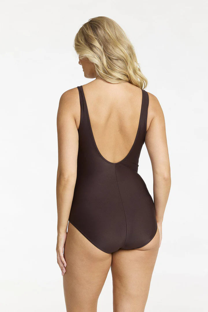 Damellas baddräkt Jennifer, som kombinerar stil och komfort med en mjukt vadderad bh inuti för optimalt stöd. Den dekorativa draperingen framtill i ett avvikande tyg ger en unik och elegant touch. Det inbyggda powernetet skapar en smickrande och slimmande effekt som framhäver din figur på ett snyggt sätt. Här i snyggt brunt med fint mönster.