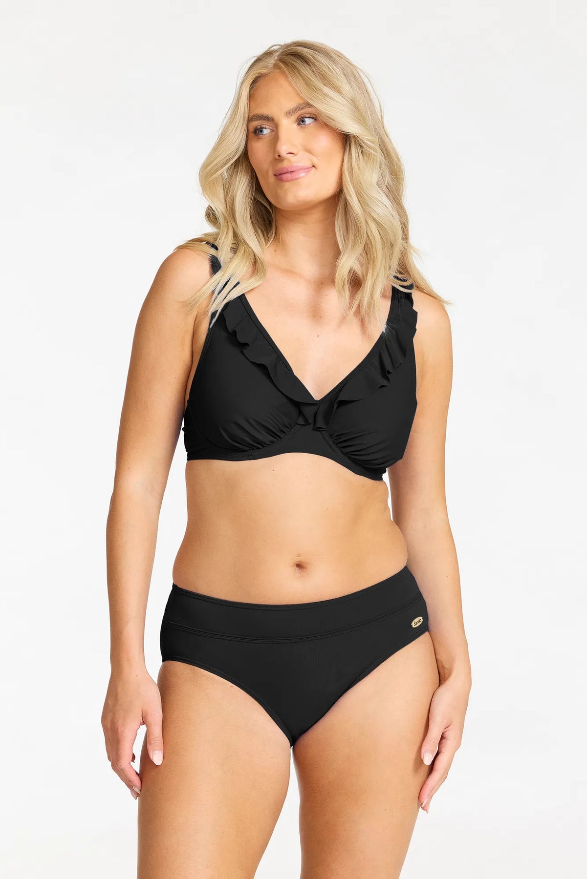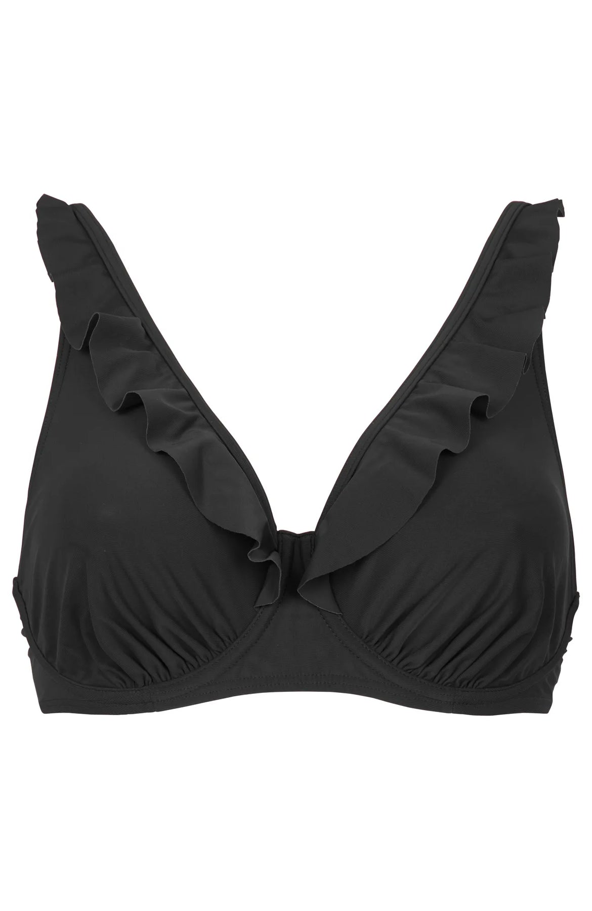 Njut av bekvämligheten med Damellas bikini BH Jamie. Denna bikini BH har bygel och lekfulla volanger som ger en feminin touch till ditt badmode. Rynkningarna i kuporna säkerställer en perfekt passform. Från D/E-kupan erbjuder modellen bredare axelband och extra stöd för ökad komfort.