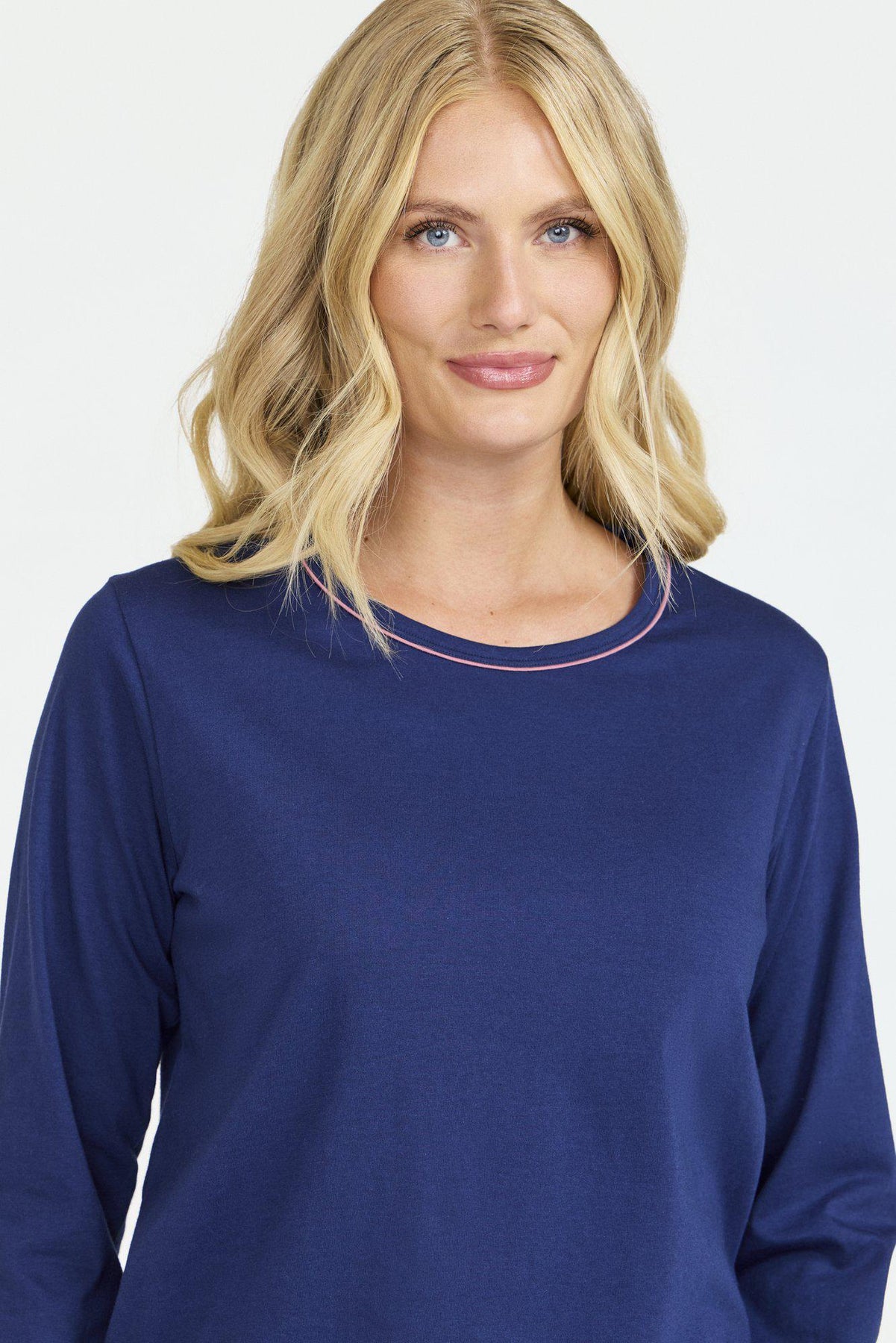 Pyjamas i mjuk och behaglig ekologisk bomull med en enfärgad topp som har rund hals och långa ärmar, samt mönstrade långbyxor med praktiska fickor och resår i midjan en tidlös kombination av komfort och stil för både nattens vila och hemmets lugna stunder.