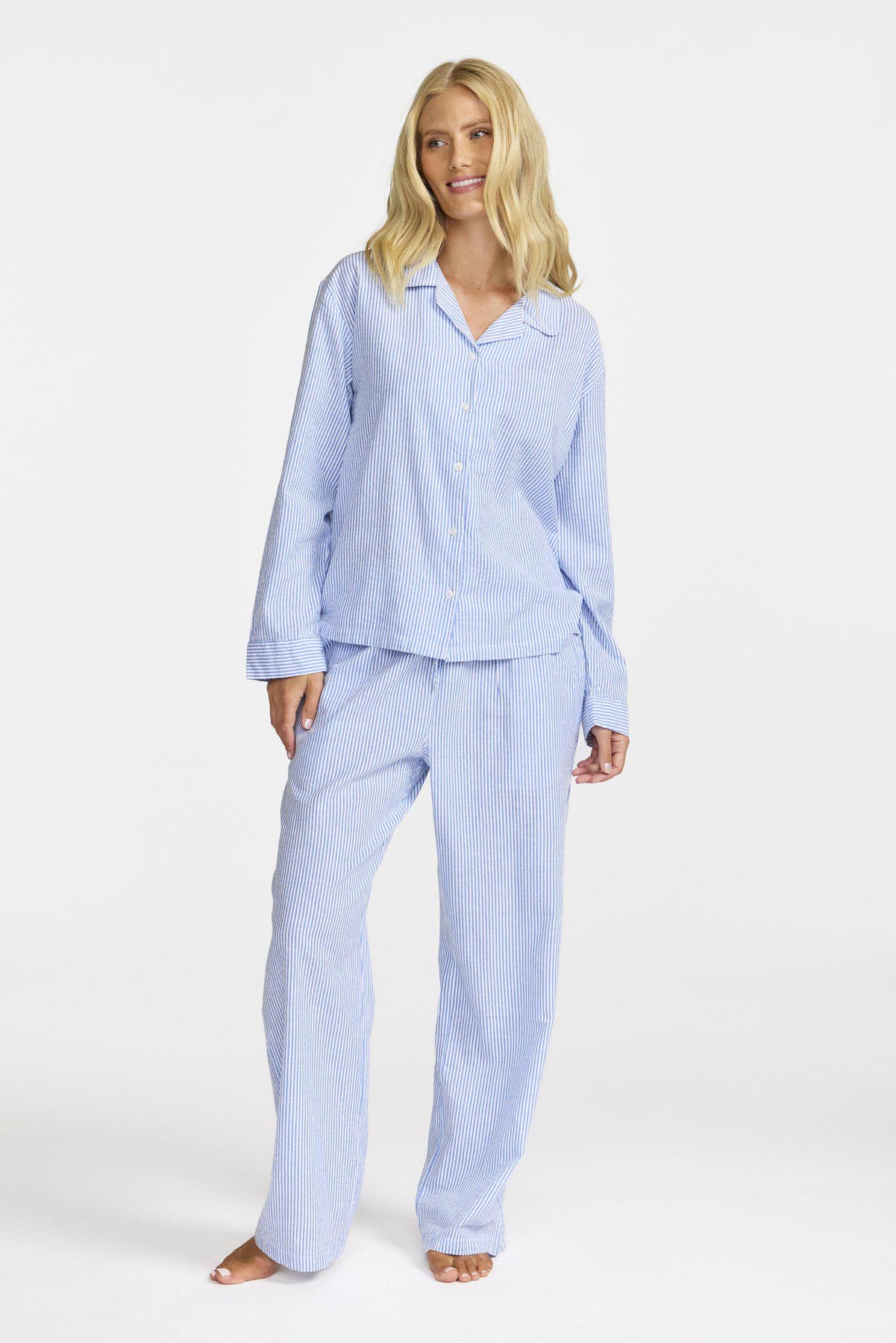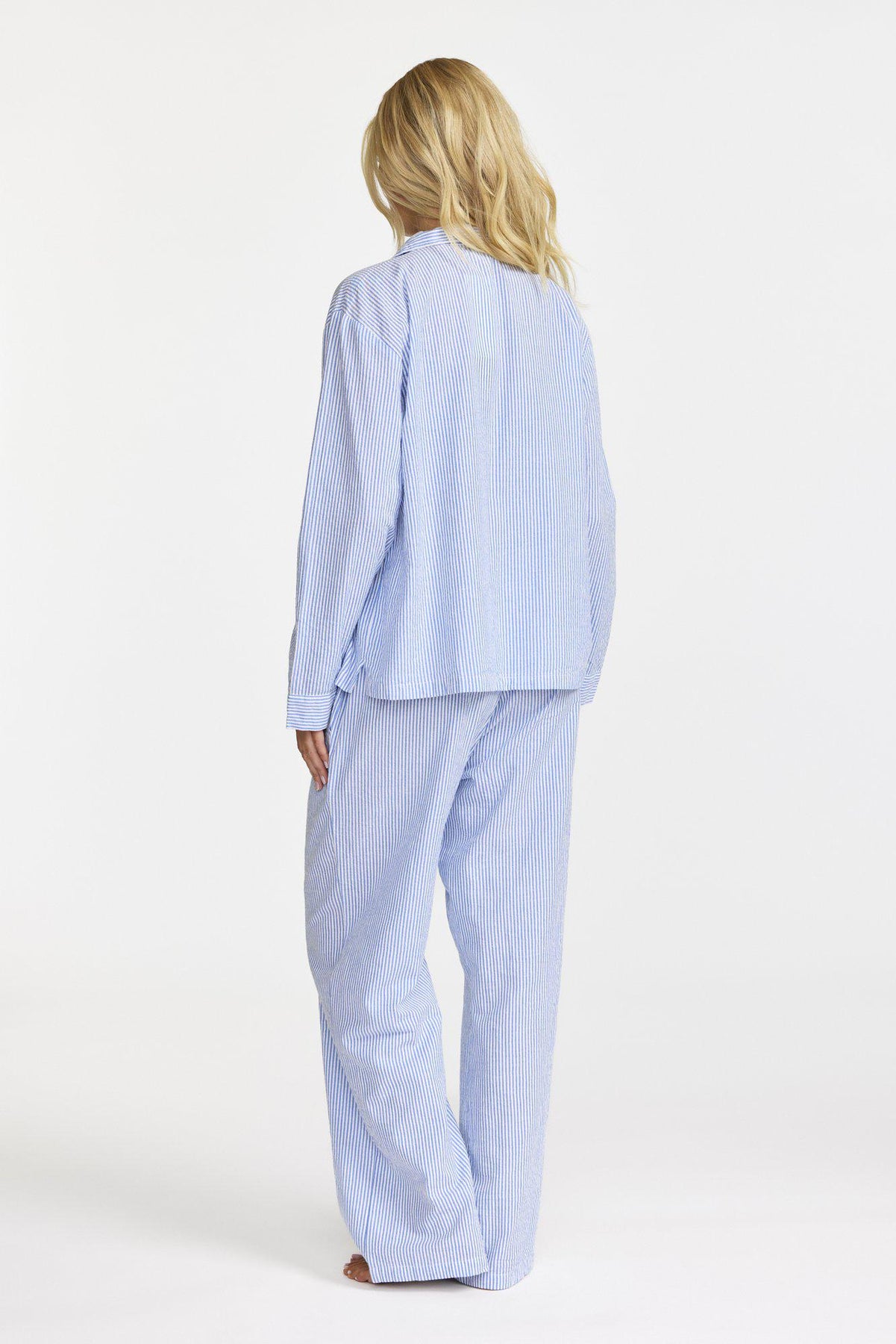 Stilfull pyjamas med rund hals och långa ärmar. De långa byxorna är smyckade med eleganta veck, har en bekväm elastisk midja och praktiska sidofickor för extra komfort och bekvämlighet under natten.