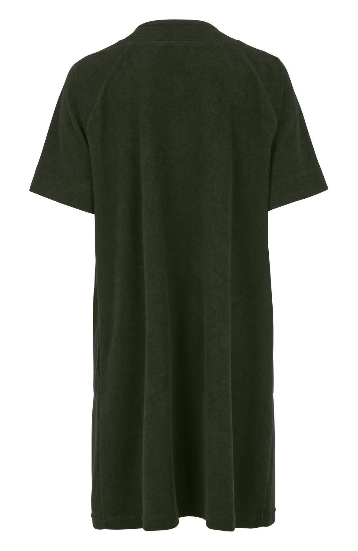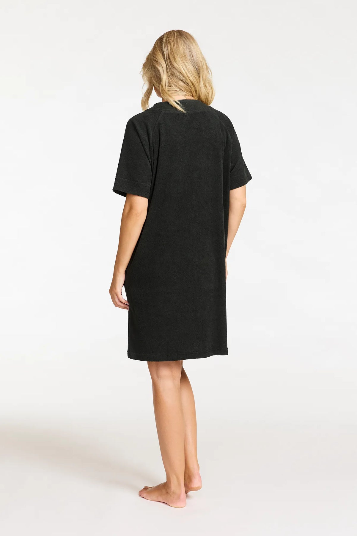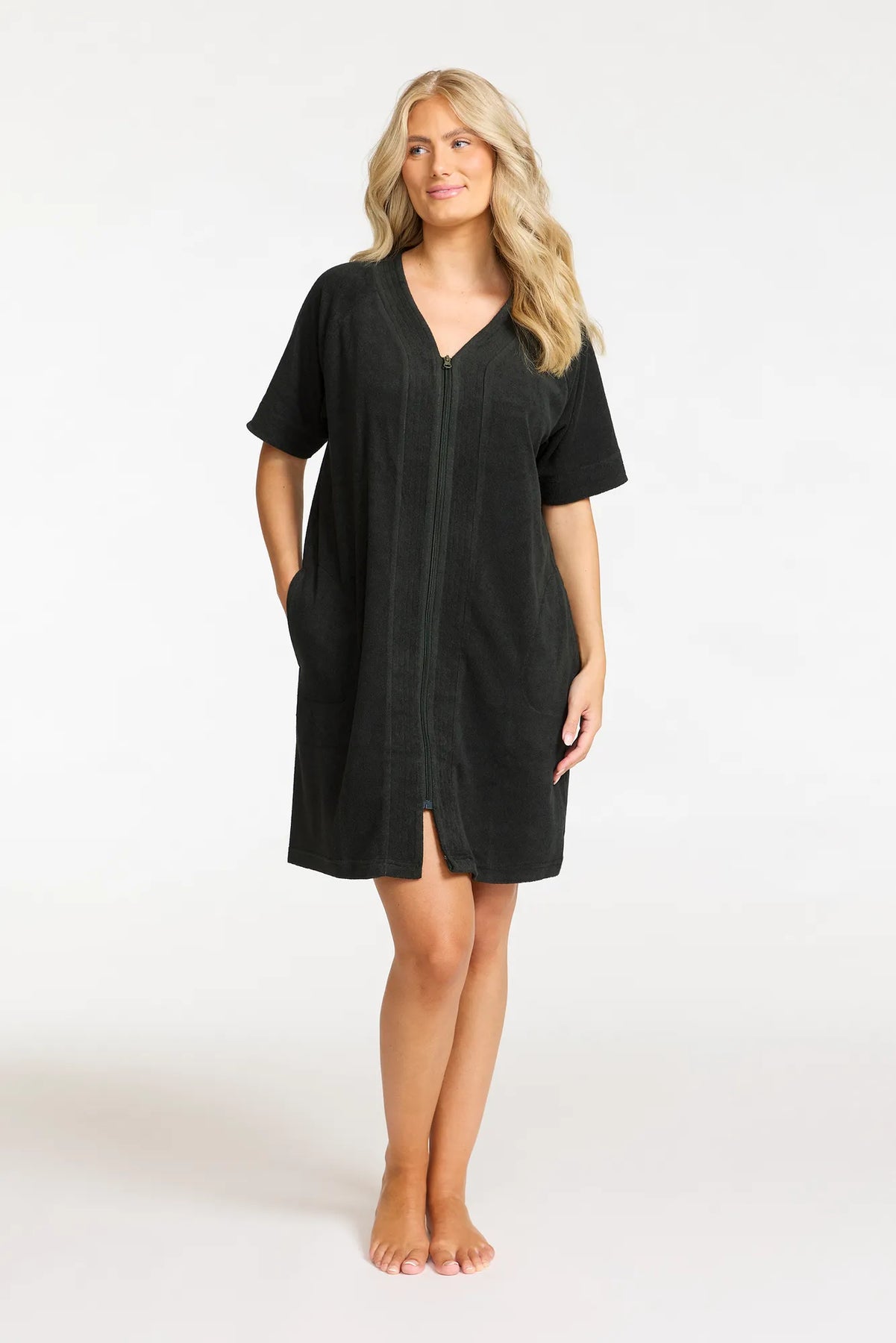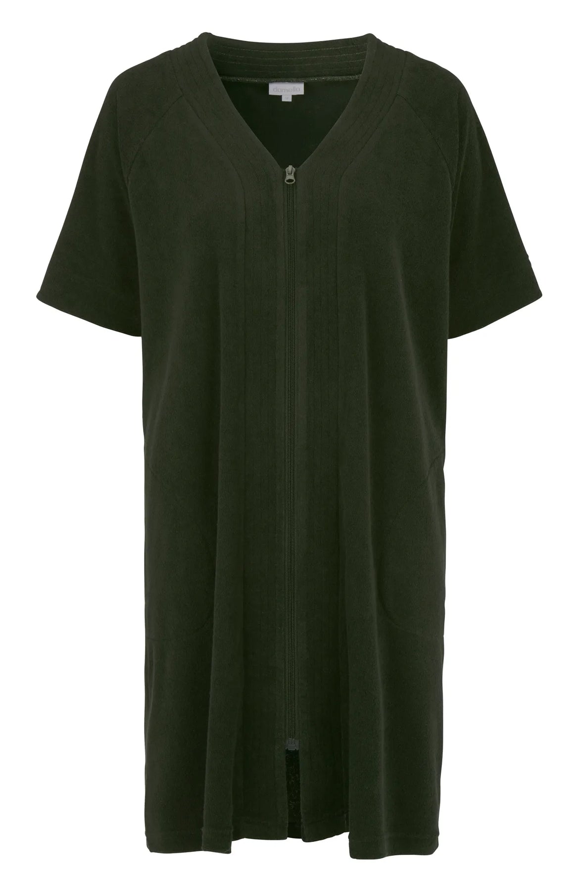 Upptäck vår rock i stretchfrotté, ett mångsidigt plagg som kombinerar funktionalitet med stil. Den har en smidig dragkedja framtill och korta ärmar för en bekväm passform. Rocken har en mjuk insida och en frottéstruktur på utsidan, vilket gör den både skön och praktisk. Det är det perfekta plagget för vardagsmys hemma eller som ett smidigt och snyggt lager över badkläderna på stranden.