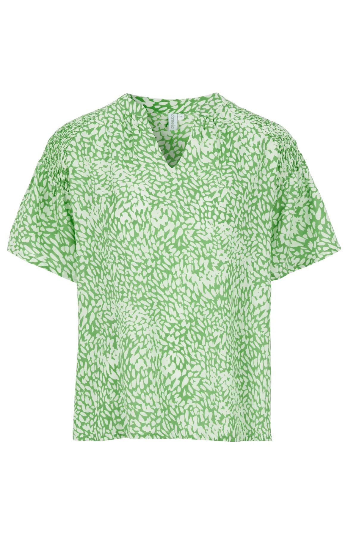 Vår blus med liten krage och V-ringning är ett elegant tillskott till din garderob. Den klassiska designen kompletteras av korta ärmar och smockning på axlarna, vilket ger en touch av trendighet. Tillverkad med omsorgsfullt utvalda material för optimal komfort och stil.