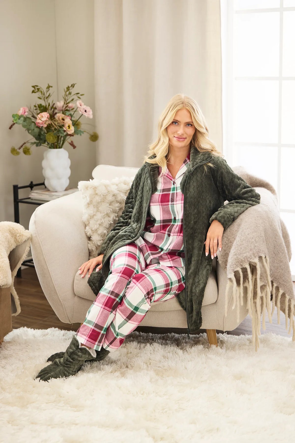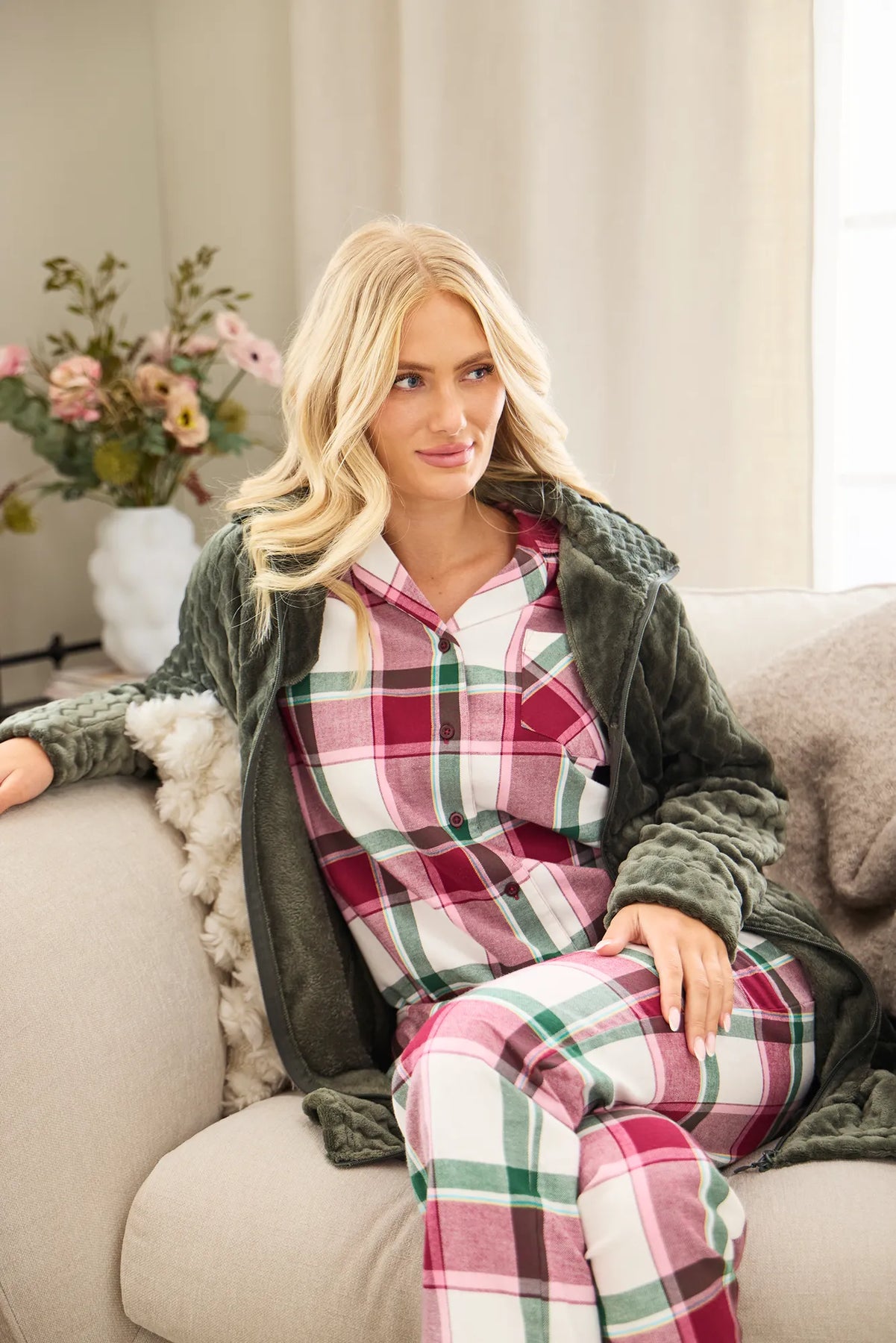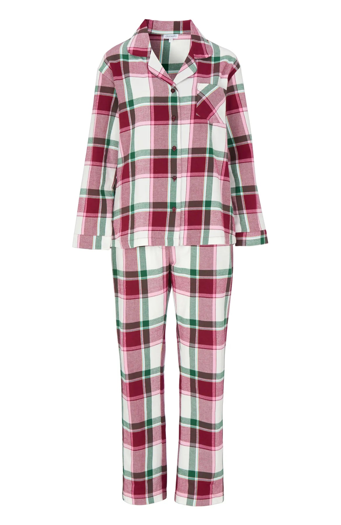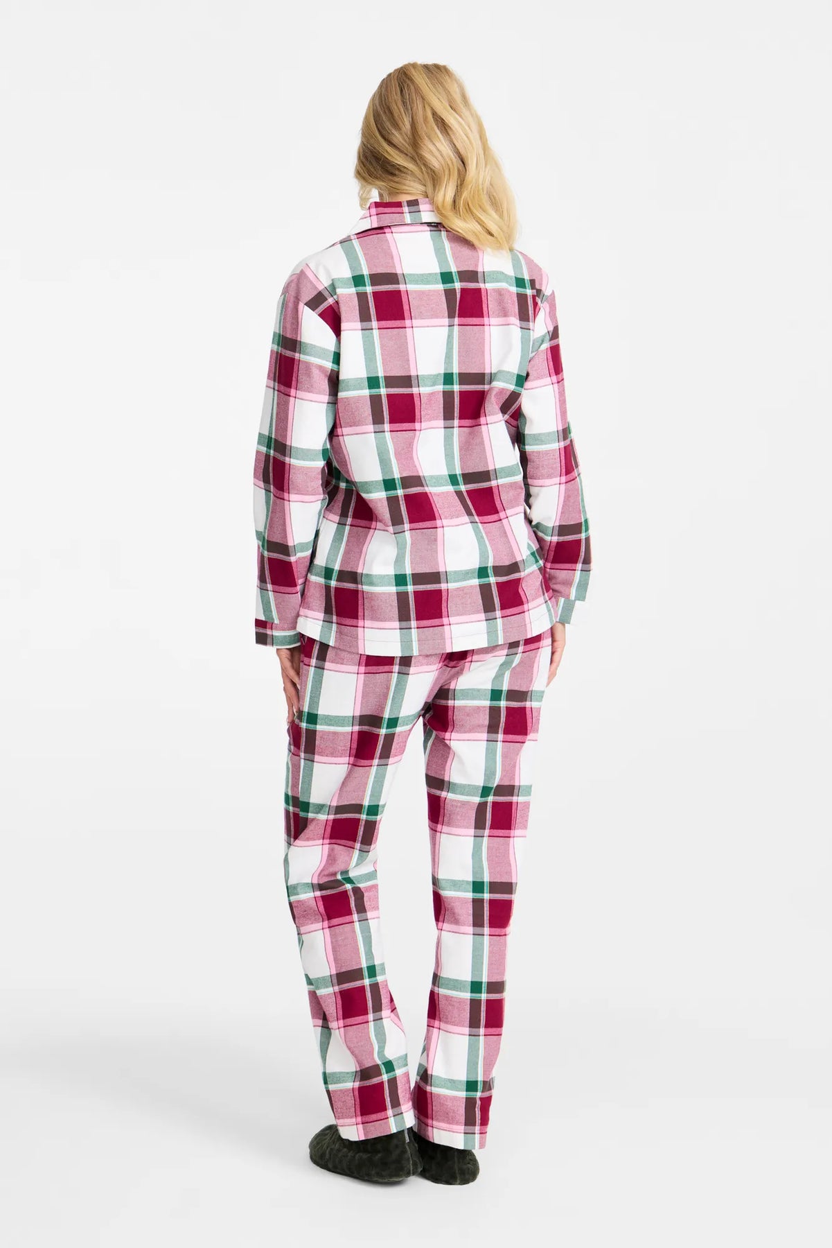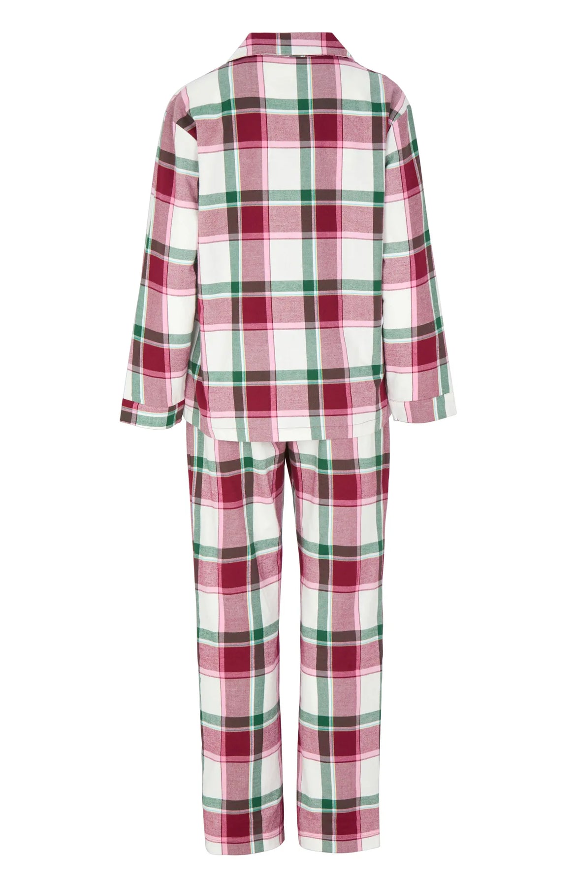 Njut av varje stund av avkoppling och komfort i vår pyjamas i rutig bomullsflanell. Designad för att ge dig både stil och komfort för lugna kvällar och nätter hemma. Designad med en elegant krage och en praktisk knäppning framtill. Samt med en elastiska resår i midjan på byxorna, som ger en bekväm passform och gör det enkelt att justera efter dina behov för en perfekt passform.