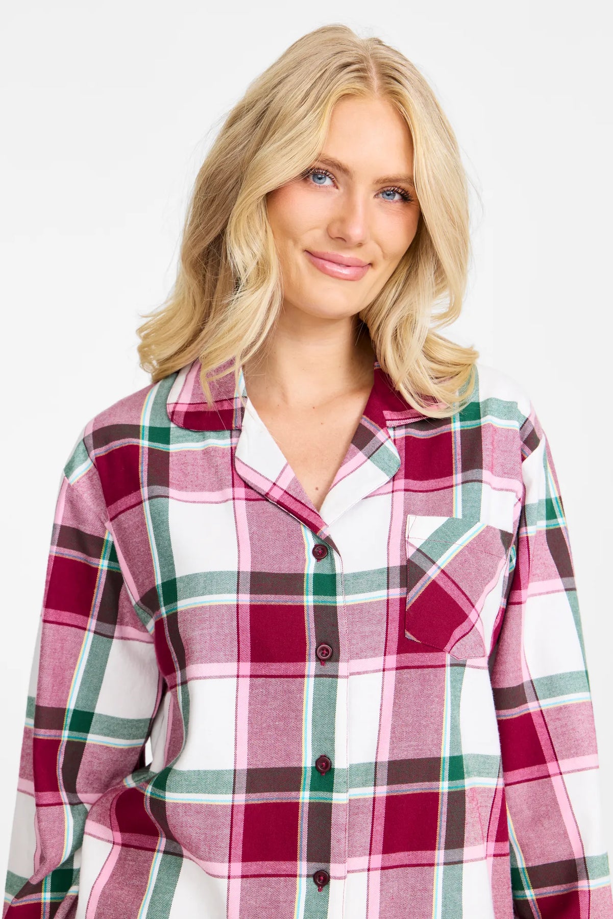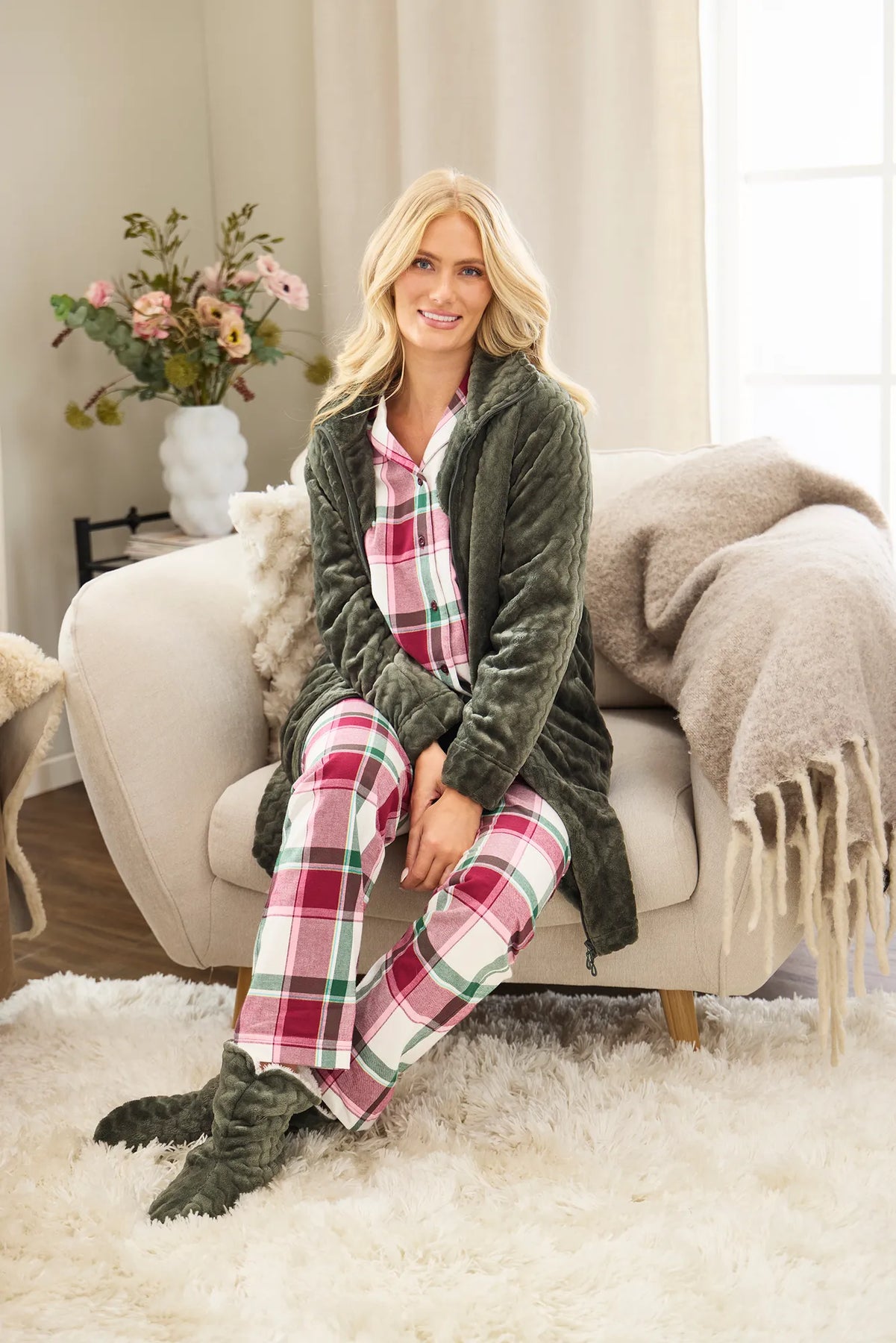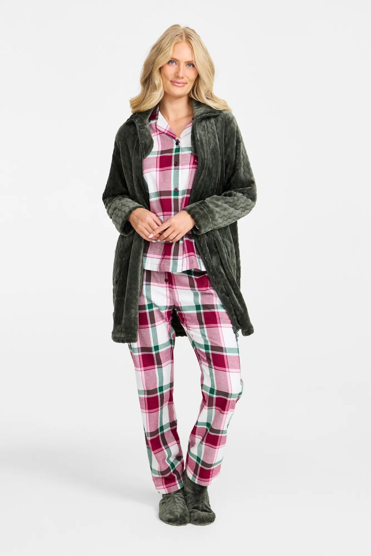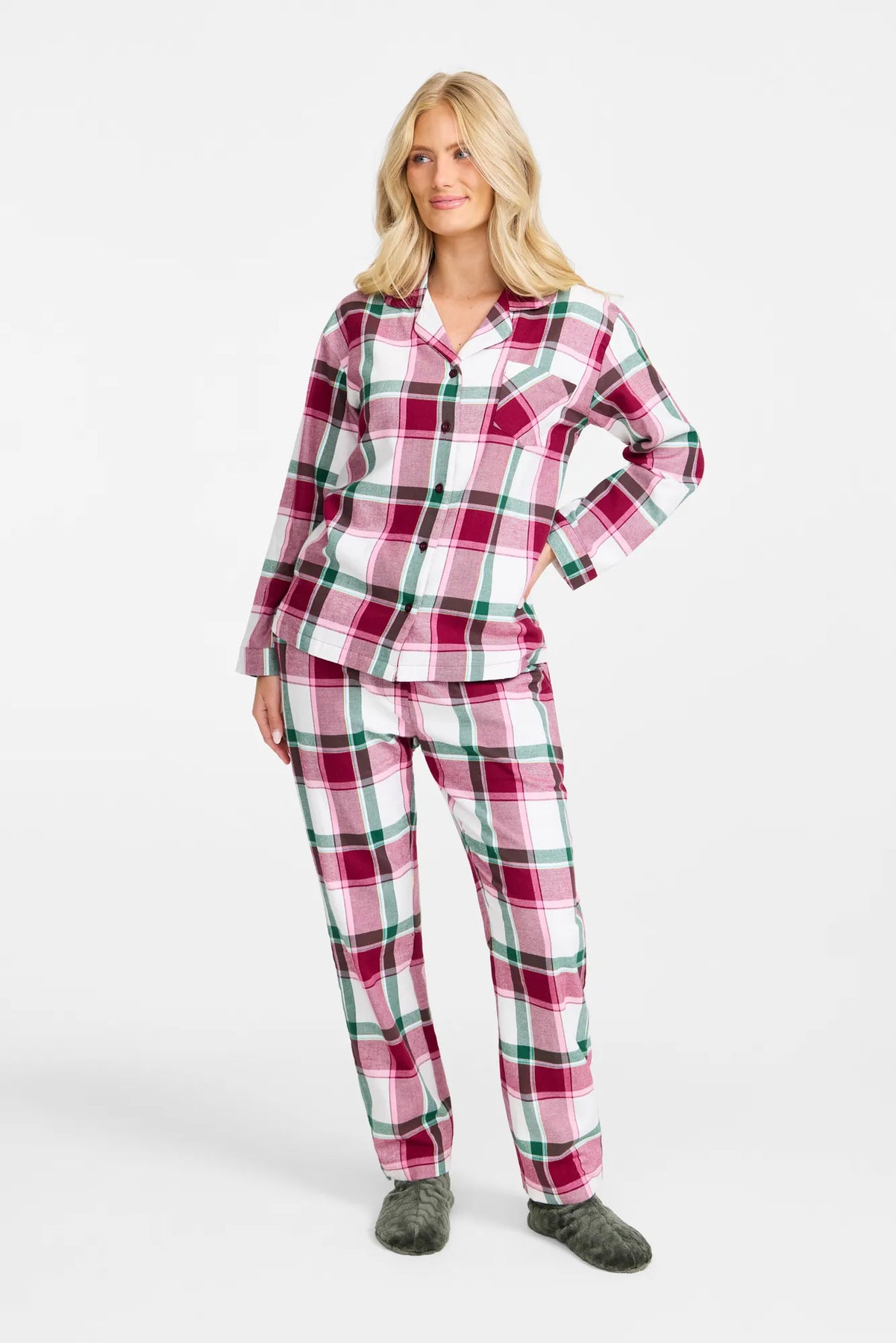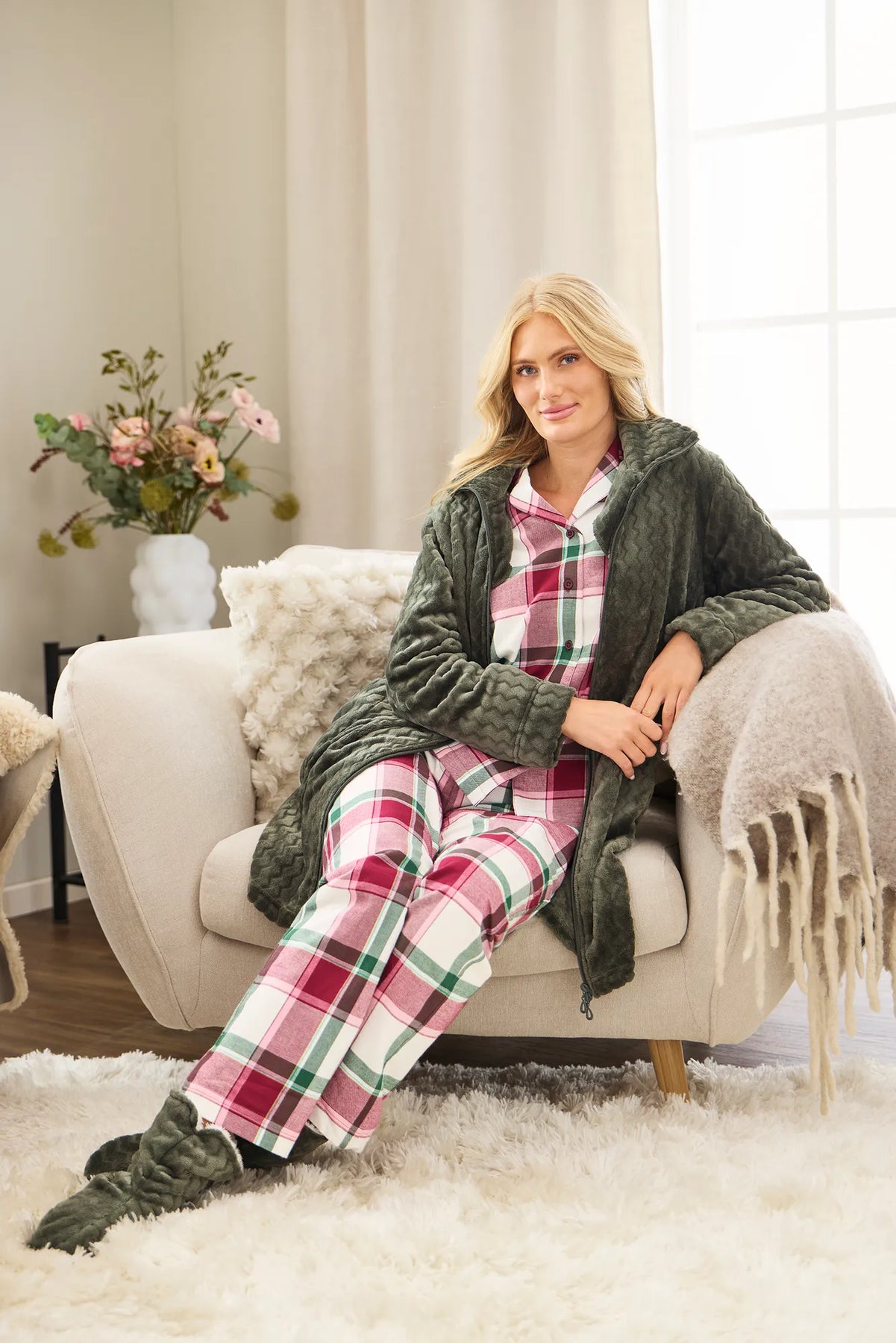 Njut av varje stund av avkoppling och komfort i vår pyjamas i rutig bomullsflanell. Designad för att ge dig både stil och komfort för lugna kvällar och nätter hemma. Designad med en elegant krage och en praktisk knäppning framtill. Samt med en elastiska resår i midjan på byxorna, som ger en bekväm passform och gör det enkelt att justera efter dina behov för en perfekt passform.