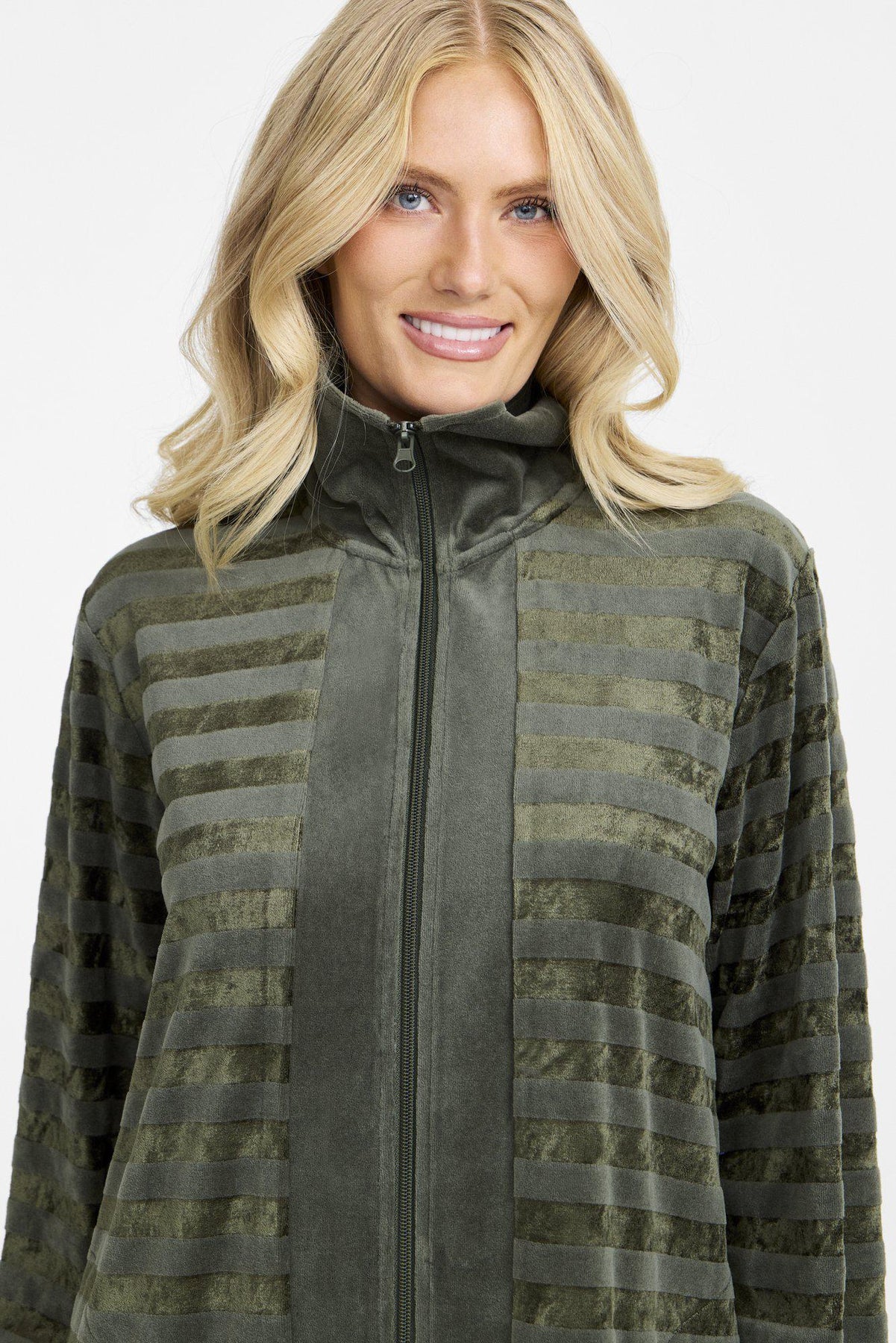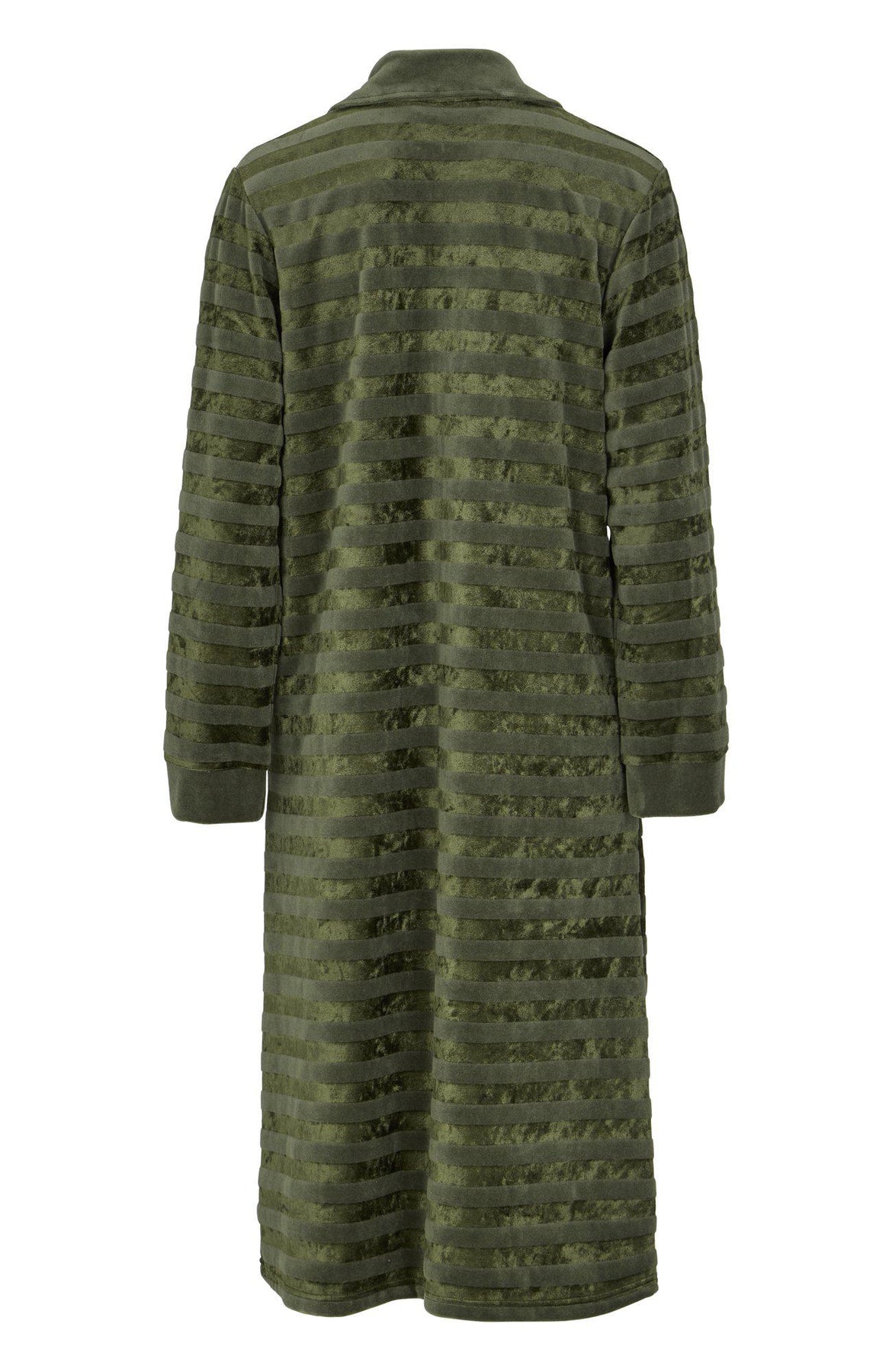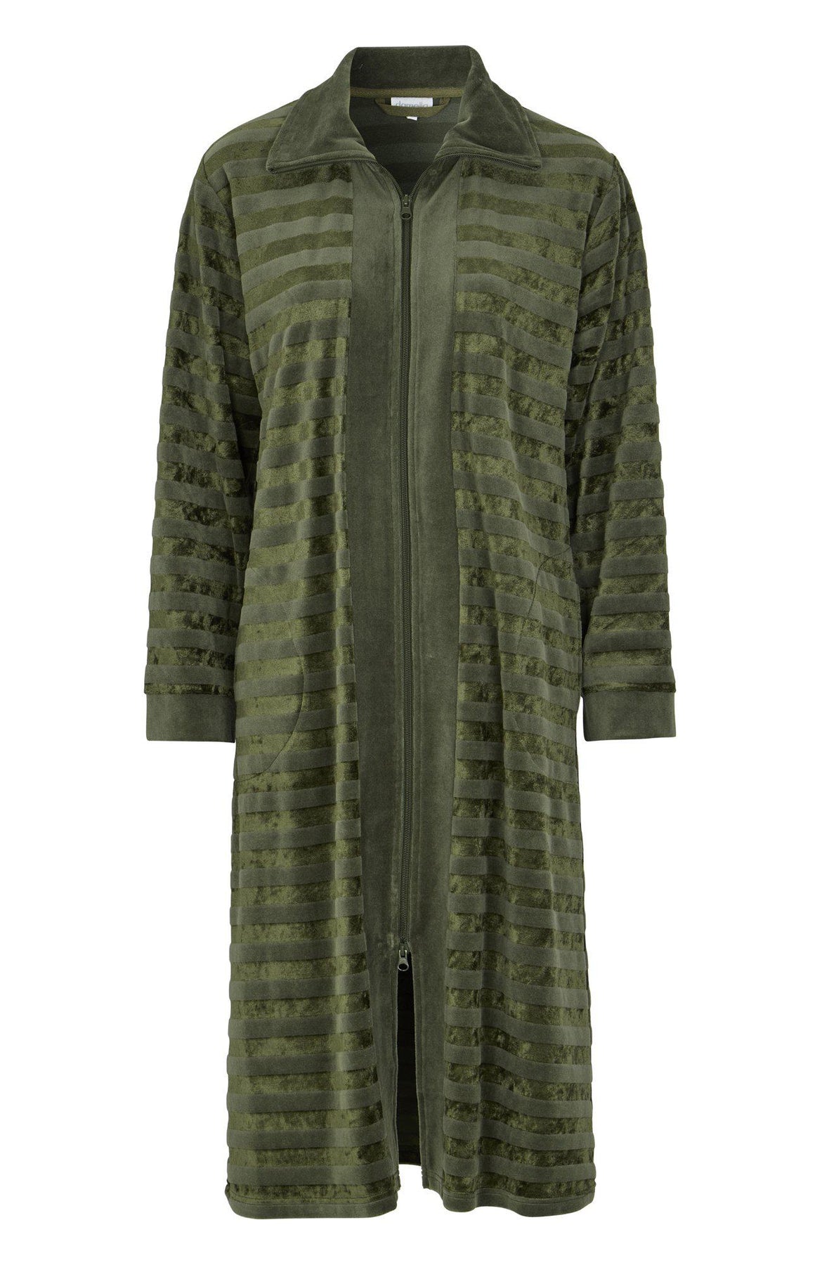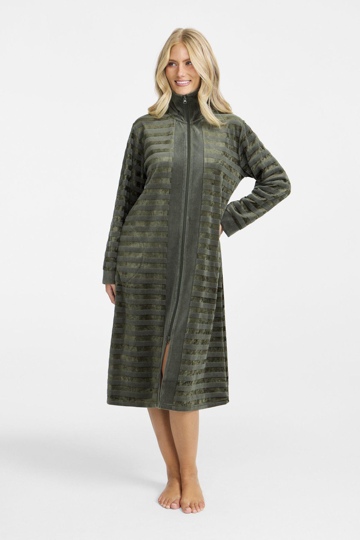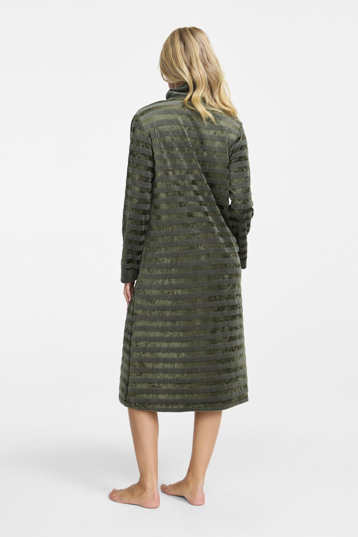 Mjuk och bekväm mysklänning eller morgonrock i mönstrad velour med krage och praktiska fickor i sidsömmarna. Utrustad med en 2-vägsdragkedja för enkel användning och justerbar ventilation. Tillverkad i en blandning av viskos och bomull, vilket ger en lättare och tunnare känsla än traditionell velour, samtidigt som den behåller en mjuk och härlig komfort.