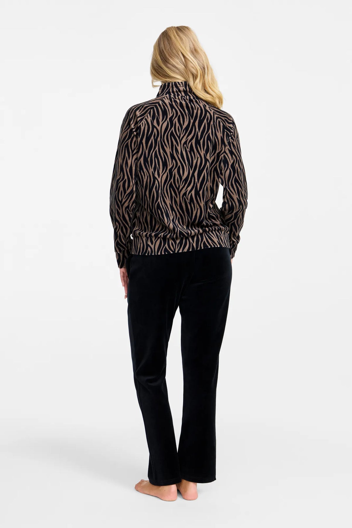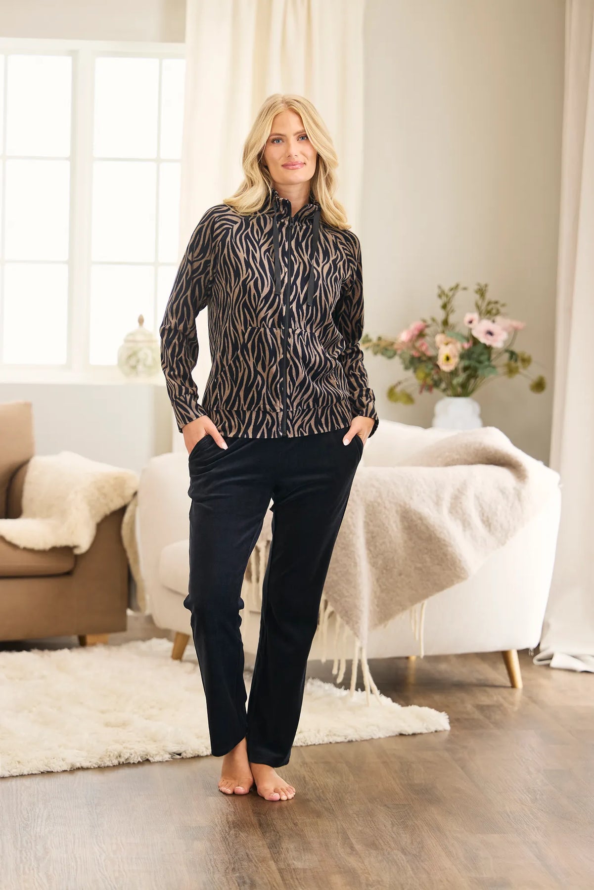 Velour mysdress bestående av en jacka i leomönstrad velour med fickor och blixtlås. Till detta matchas byxor i enfärgad svart velour, designade med resår i midjan och fickor i sidsömmarna. Ett bekvämt och stiligt set som passar perfekt för både avkoppling och vardagsbruk.