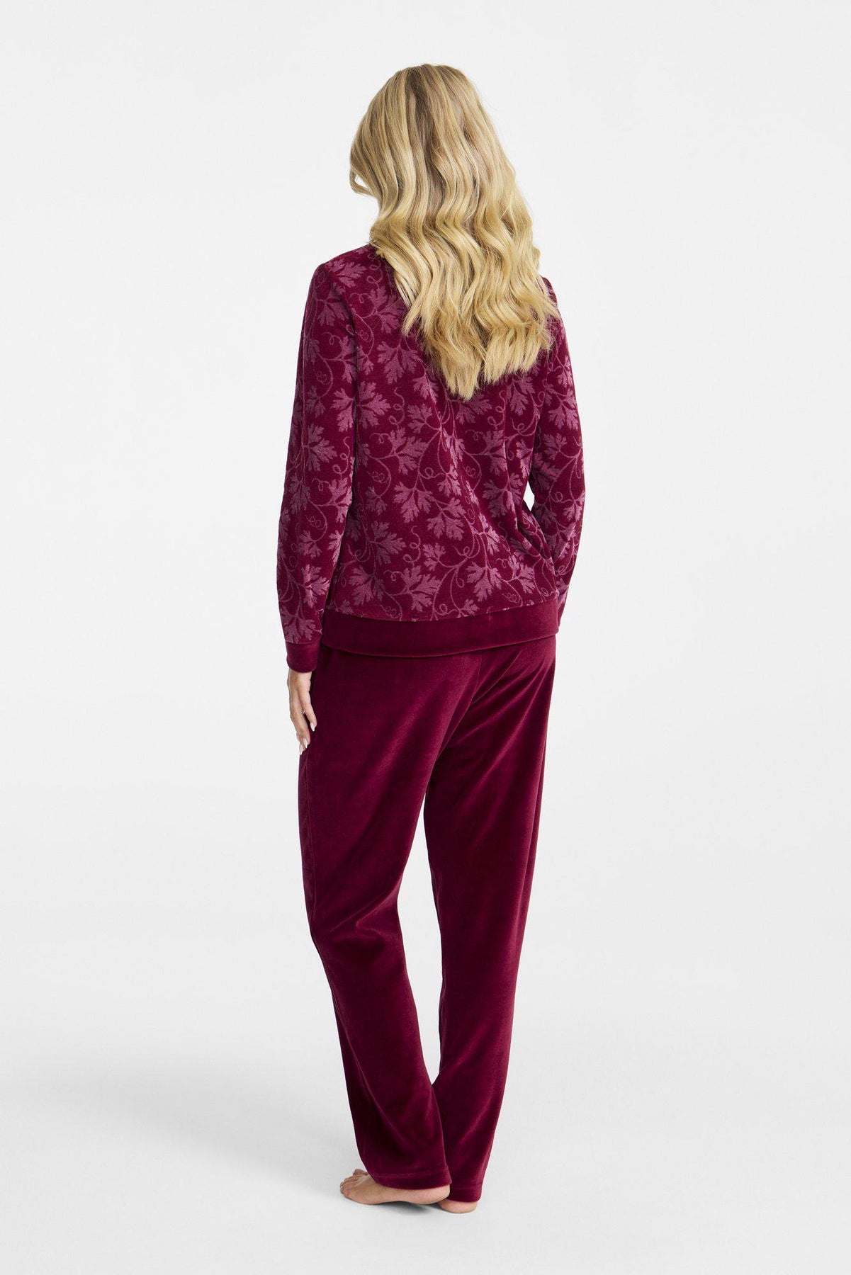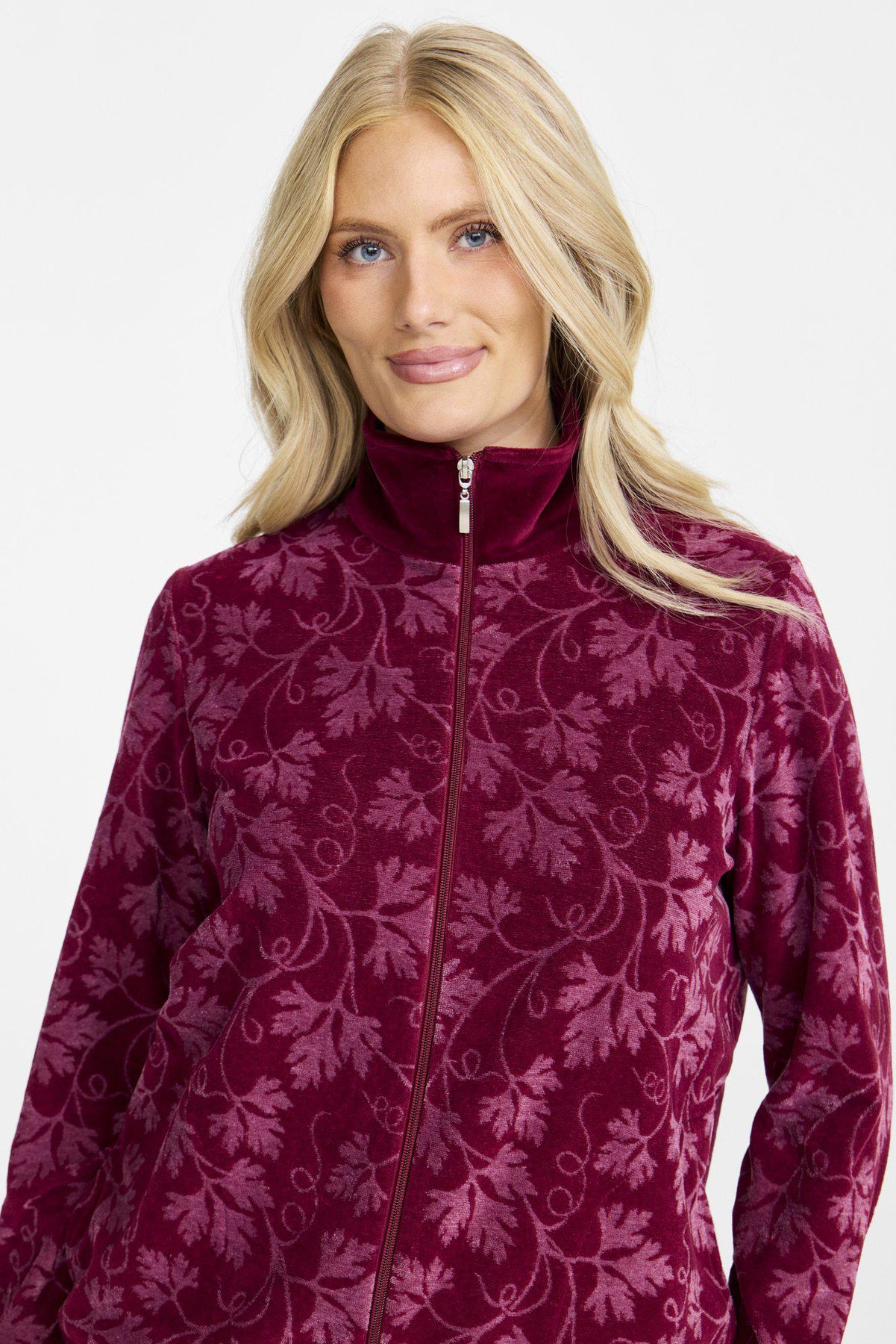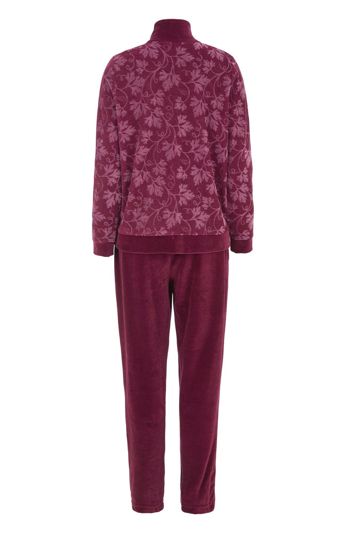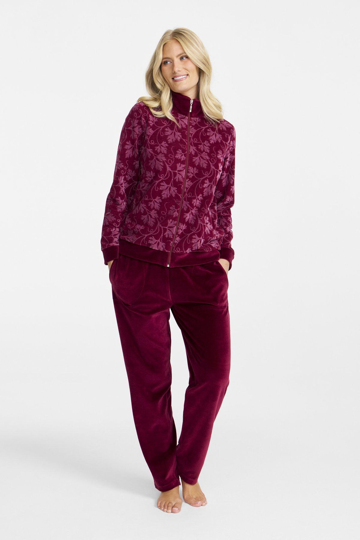Elegant och mjuk mysdress som kombinerar stil och komfort. Jackan i jacquardmönstrad velour har krage och muddar i enfärgad plain velour, samt praktiska fickor och en blixtlåsstängning, vilket gör den både funktionell och snygg. Byxorna i enfärgad velour har resår i midjan och fickor i sidsömmarna för en bekväm passform och extra funktionalitet.