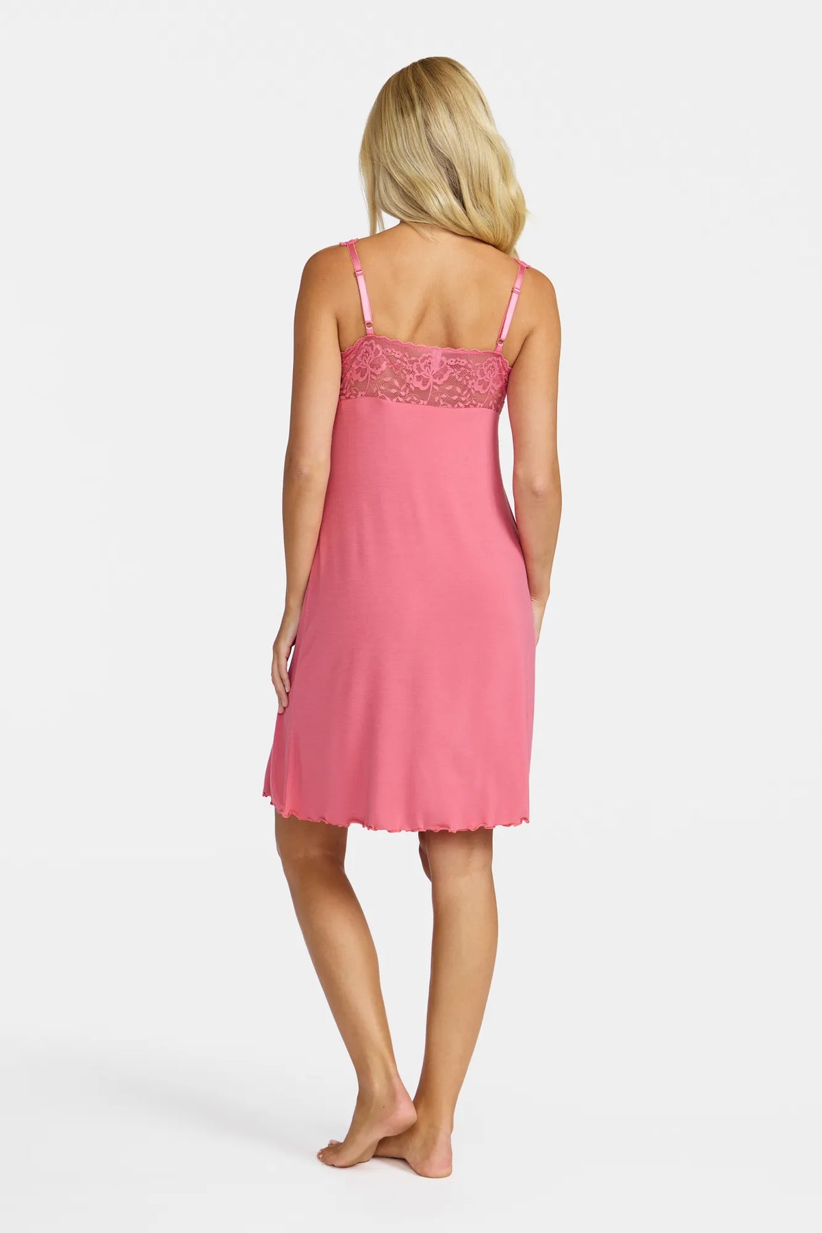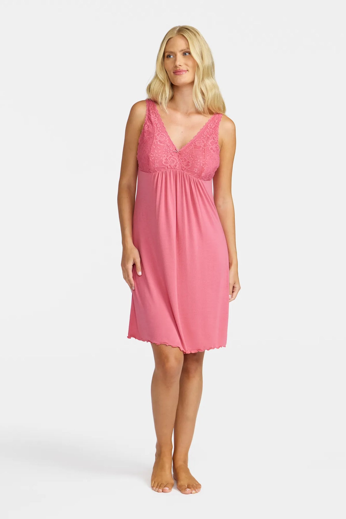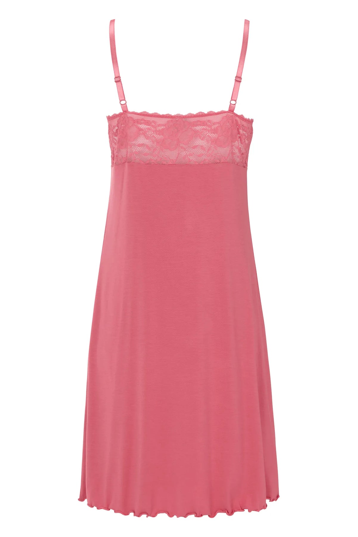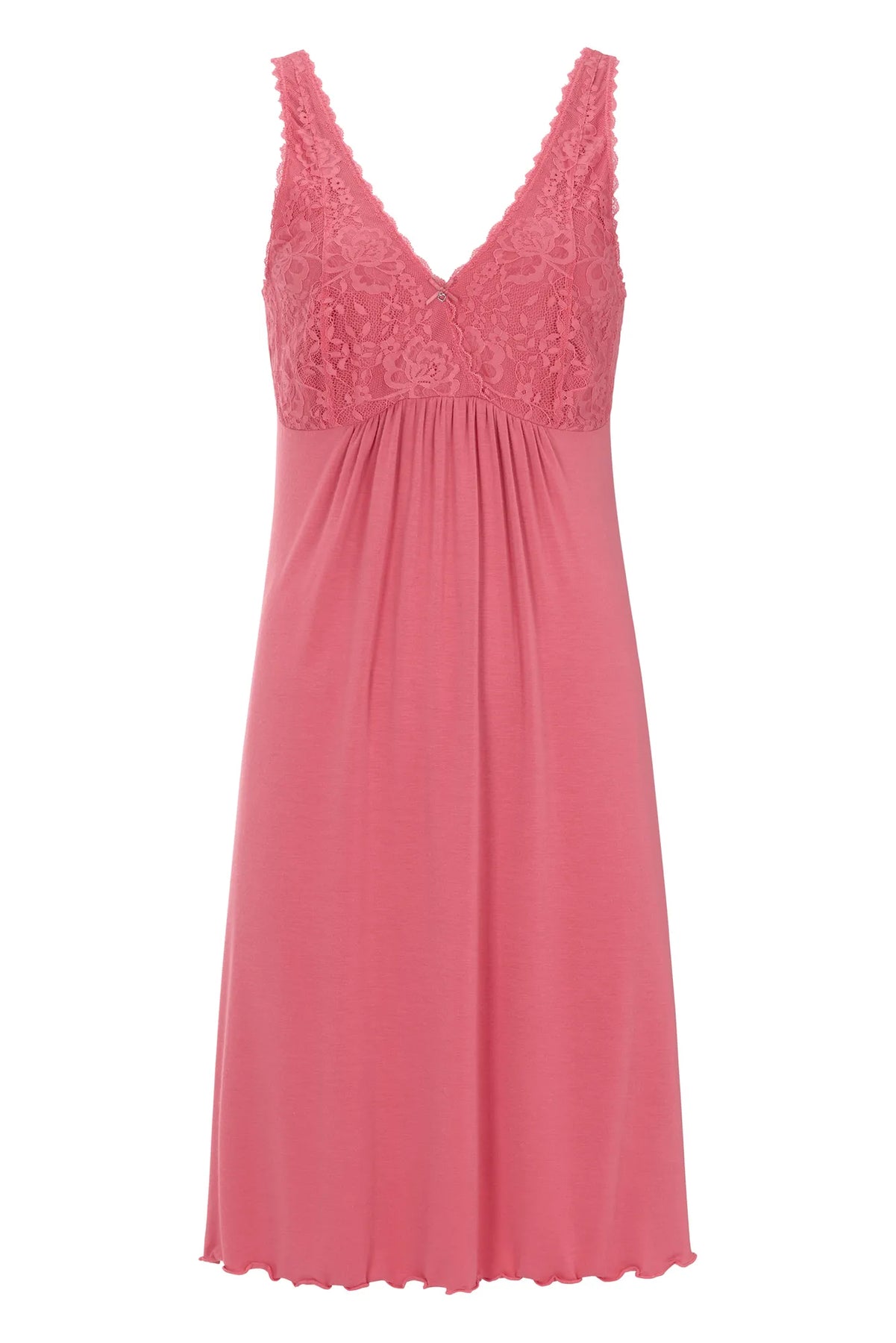 Utforska vårt eleganta ärmlösa nattlinne med en V-ringning och delikat spetsdetalj upptill. Tillverkat i mjuk och luftig viskos, med fodrade spetskupor för ökad komfort, erbjuder det en lyxig och bekväm upplevelse.