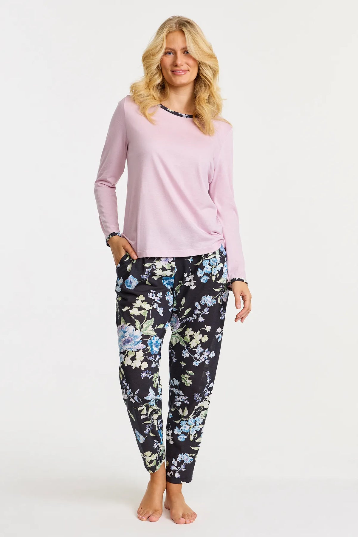 Pyjamasbyxor i mjuk bomull med pressveck fram för en stilren och klassisk look. Byxorna har resår i midjan för bekväm passform samt praktiska sidfickor. Det värmande bomullstyget gör dem perfekta för kyligare nätter och mysiga stunder hemma.