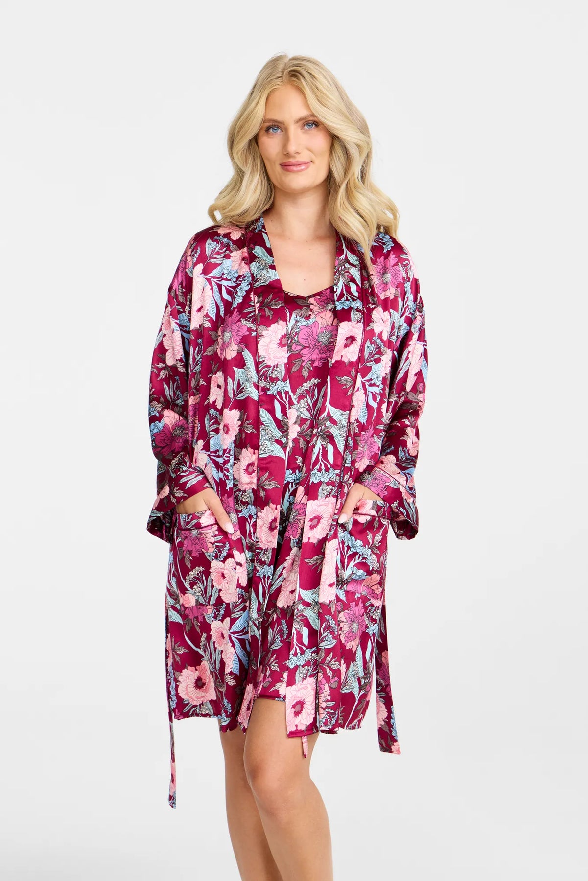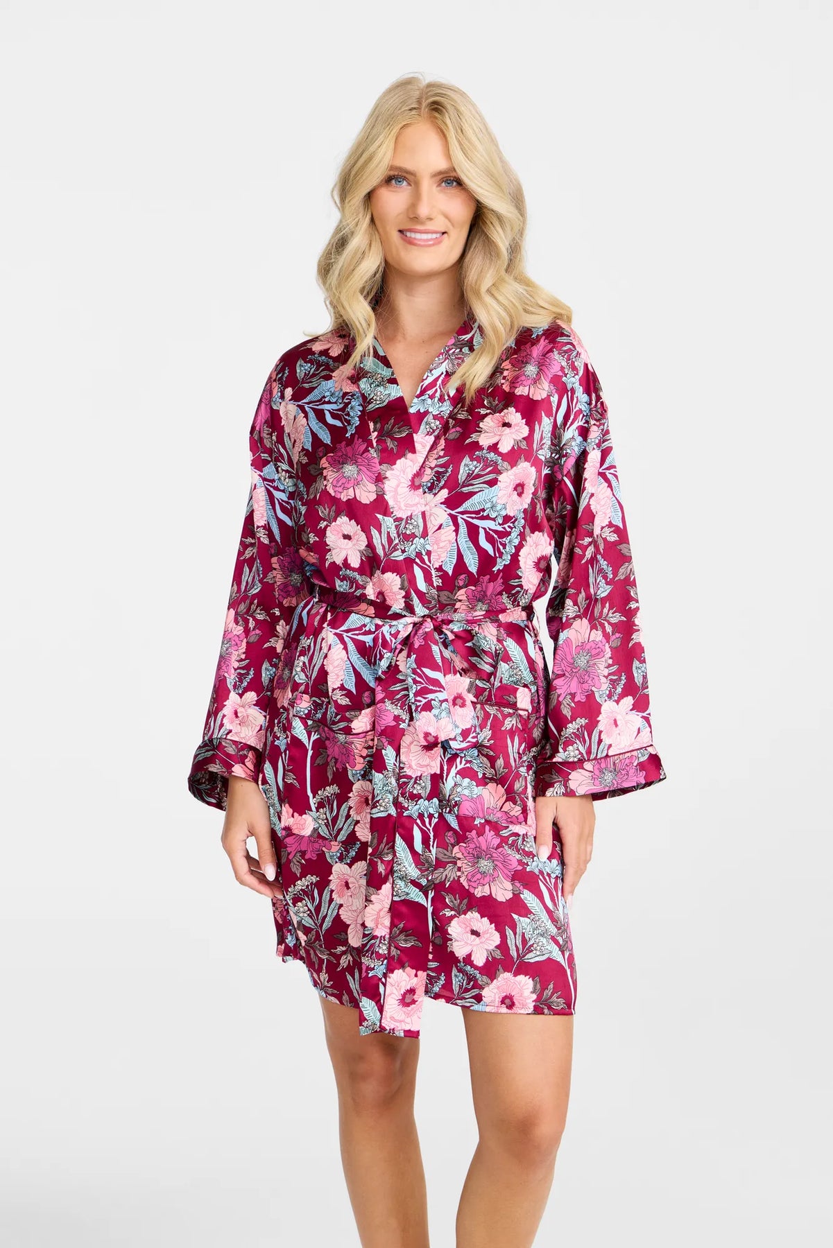 Elegant omlott-rock i mönstrad polyestersatin som ger en lyxig känsla. Utrustad med praktiska fickor för bekvämlighet och stil. Perfekt att svepa om sig för en avslappnad och sofistikerad look hemma.