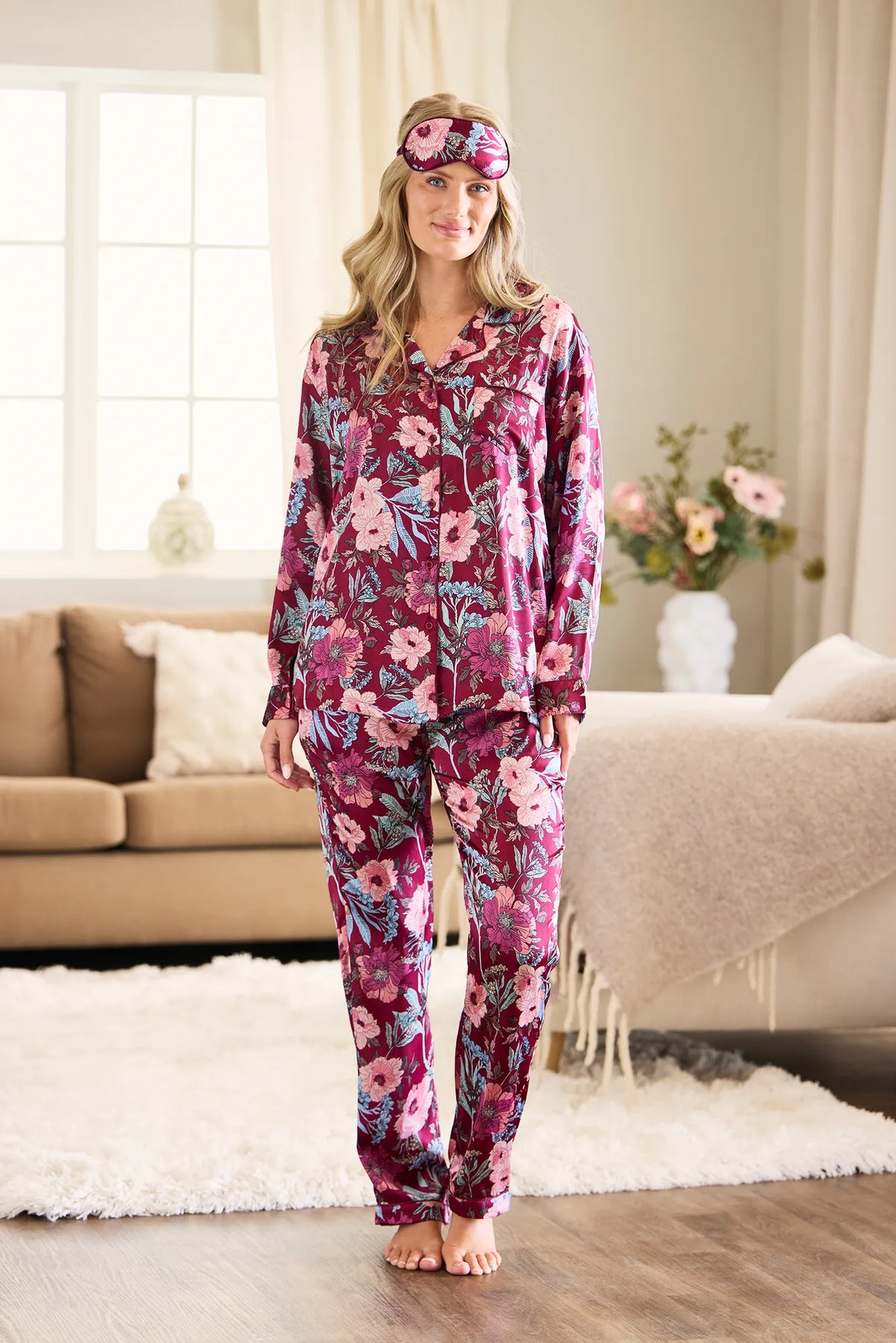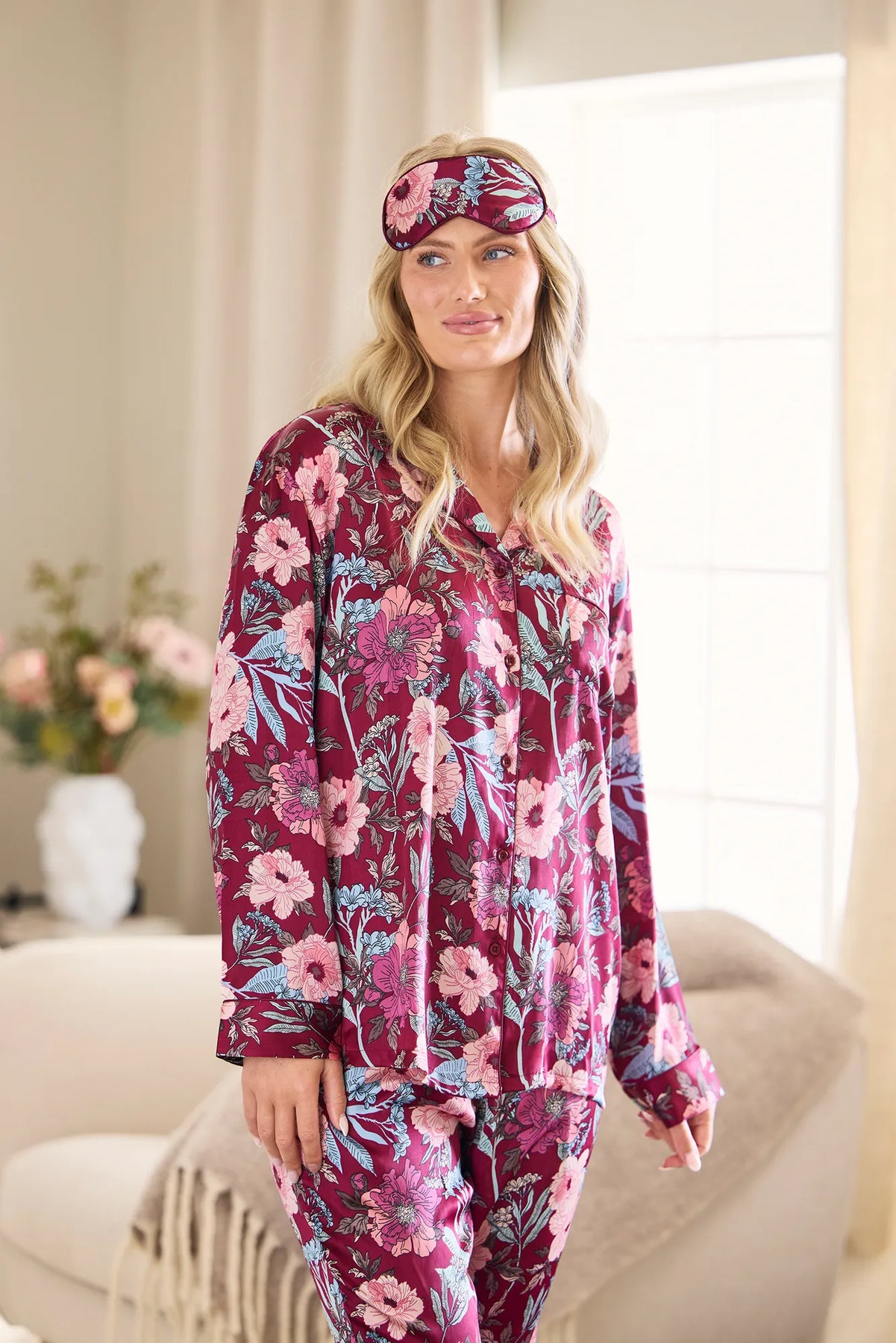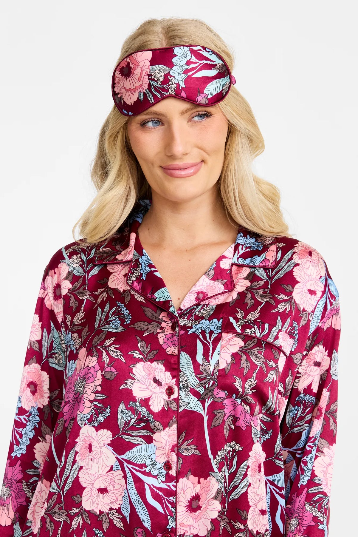 Sovmask i mönstrad polyester satin, mjukt vadderad för extra komfort mot huden. Blockerar effektivt ljus för en bättre natts sömn och hjälper dig att slappna av oavsett tid på dygnet.