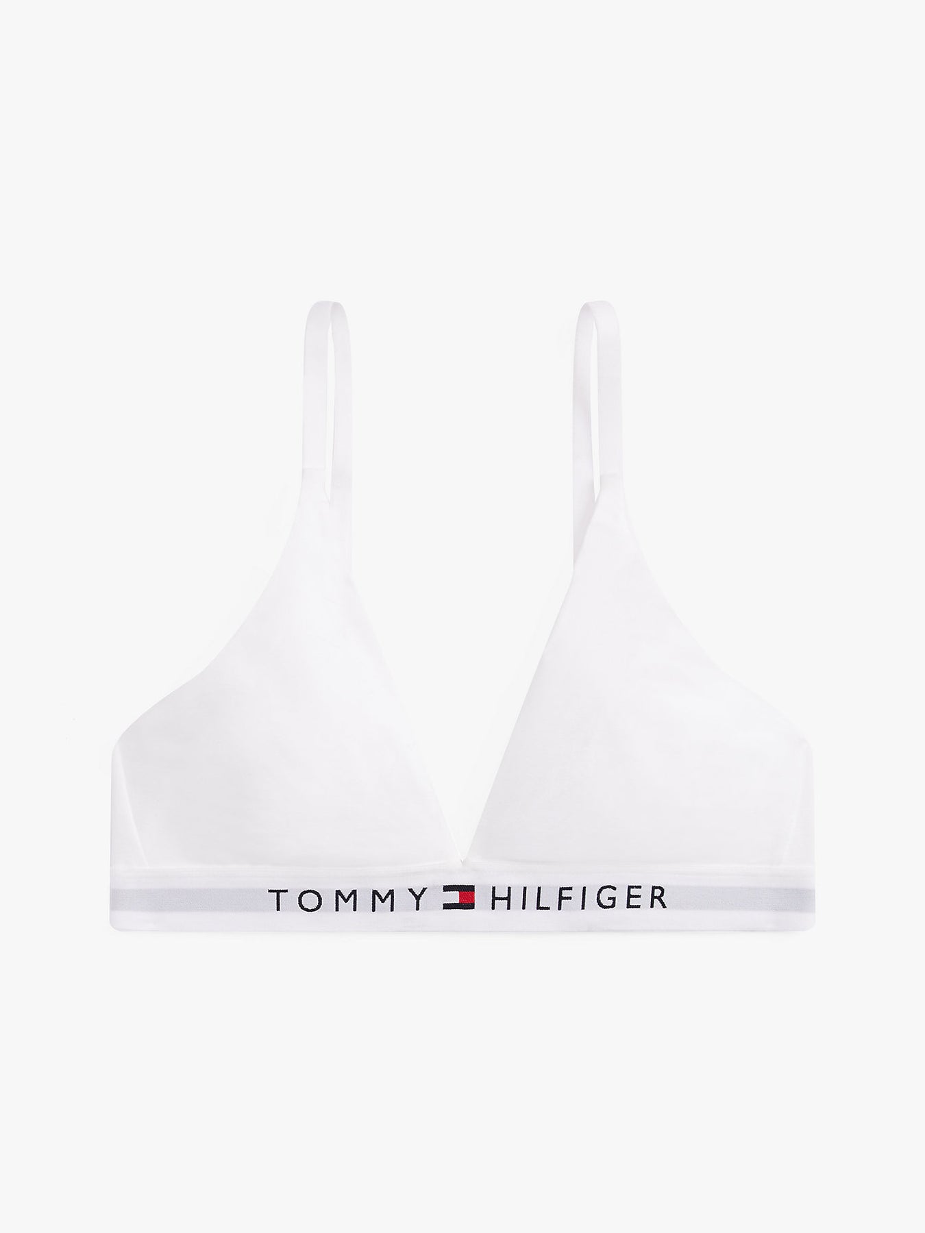 Snygg klassisk triangle bh från Tommy Hilfiger. Lätt vadderad kupa, reglerbara axelband och knäppning i rygg. Tommy loggan i resår och som snygg detalj även Tommys färger i spännen i ryggen. Material 90 % bomull 10 % elastan